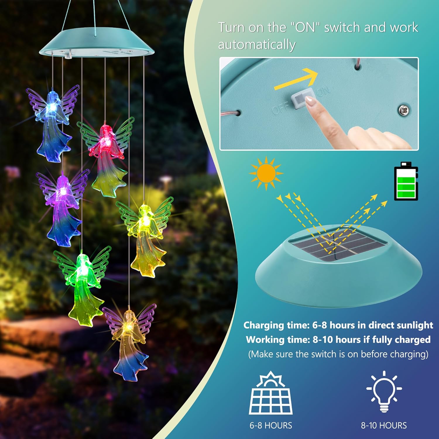 - 【Solar Powered Wind Chimes】 Featuring a unique design with 6 angel lights charge automatically in the daytime and light up at night, free your hands, new version solar panel absorbs energy quickly, the solar wind chimes lights can last up to 8-10 hours after fully charged.(Gift for Mom, Gifts for Grandma, Mom Gift, Grandma Gift, Birthday Gift for Mom, Birthday Gift for Grandma)