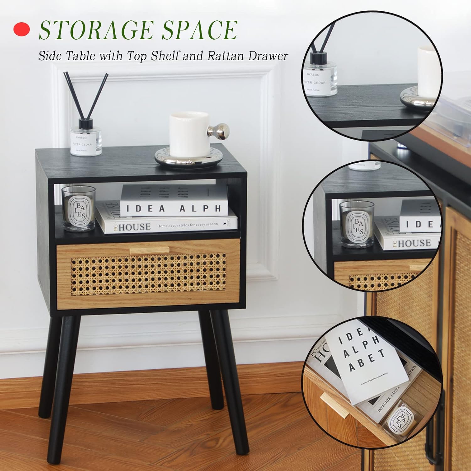 MaxSmeo End Table with Storage Mid Century Nightstand with Rattan Drawer and Shelf, Wood Small Side Coffee Table for Small Space, Living Room and Bedroom, Easy Assembly (Black)