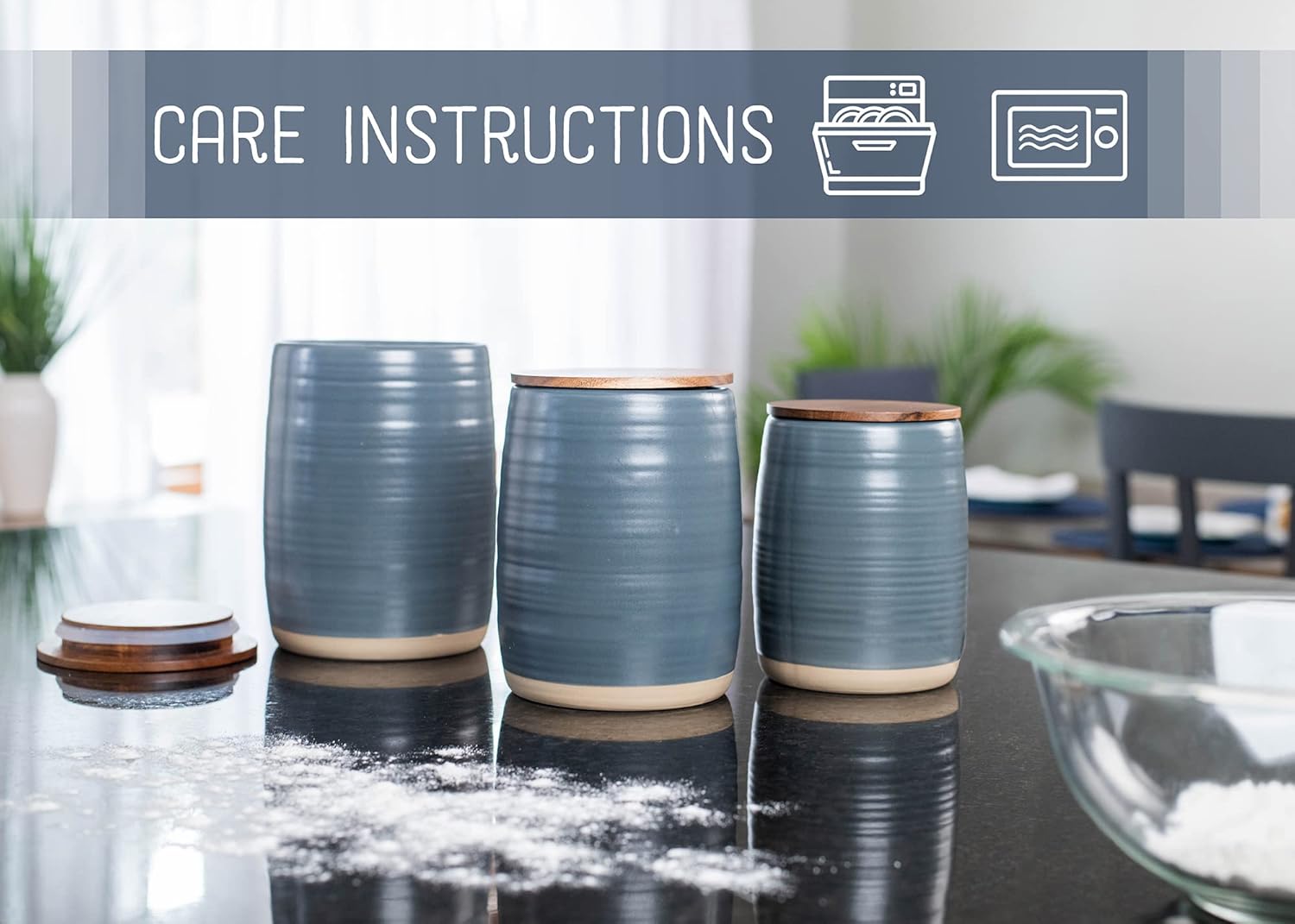 - THREE (3) PIECE SET - Includes three kitchen canisters of various sizes; Each includes a wooden lid with sealing rubber gasket around the rim