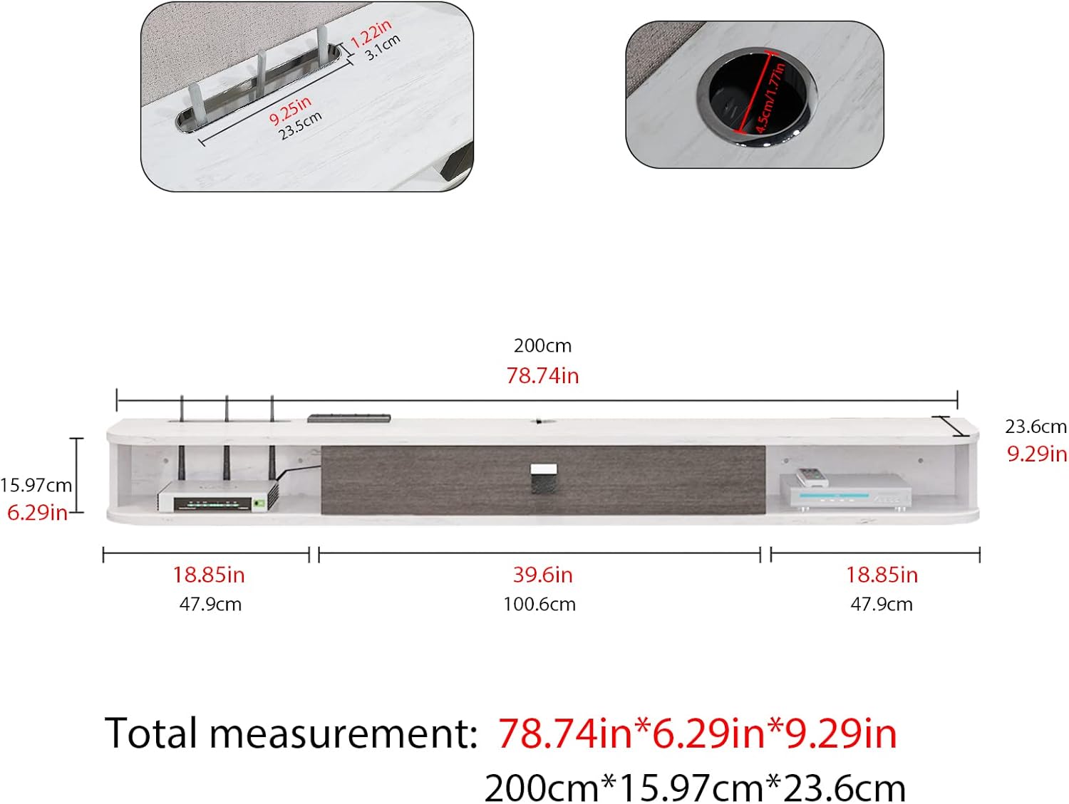 - 【Make your Room Tidy】Equipped with cable hole for hiding set-top box antenna, the floating tv console helps to keep all items in order and easy to get, and keep your items clean and tidy. Contemporary TV wall lamp with creative design is the perfect solution to save home space and optimize space usage.