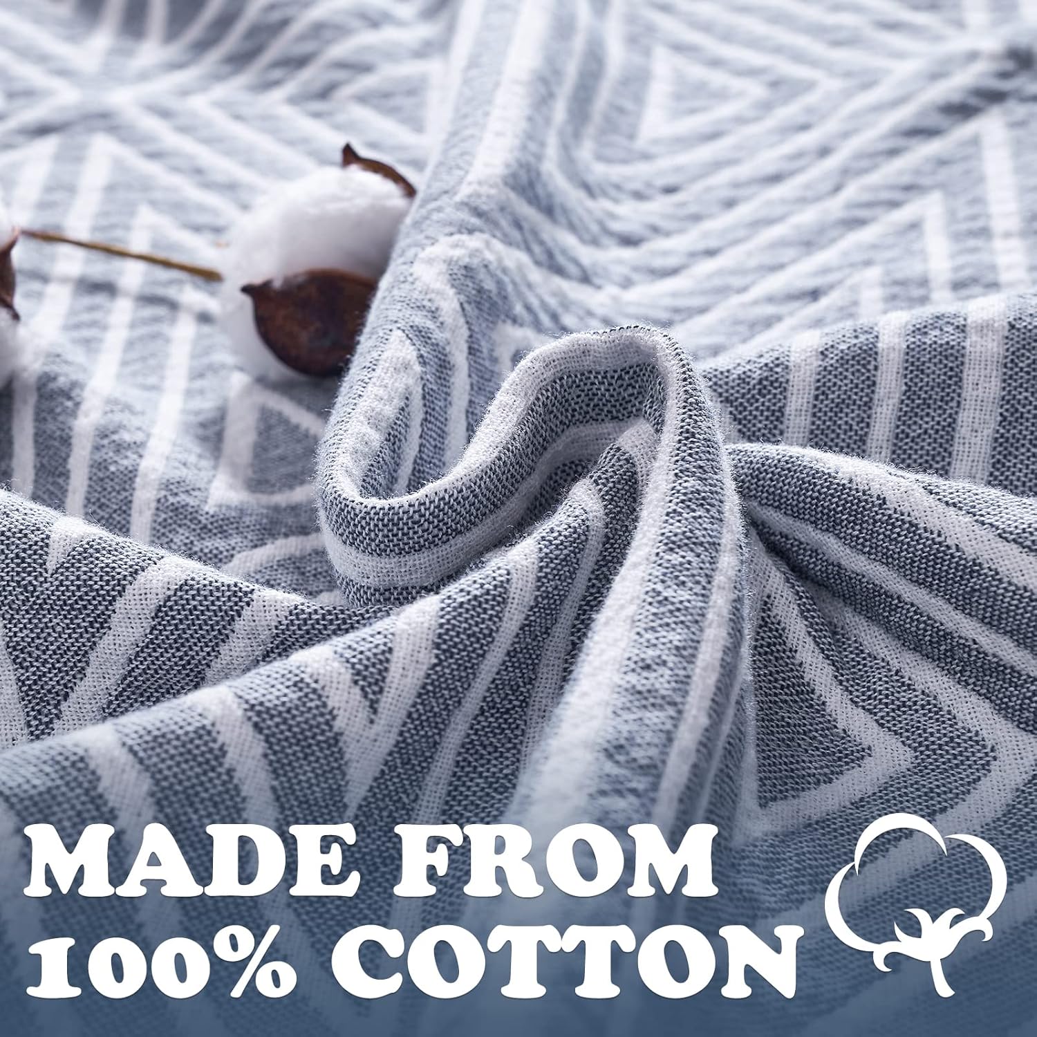 JINCHAN Boho 100% Cotton Blanket Muslin Twin Size 60x80 Inches Lightweight 3-Layer Geometric Triangle Striped Pattern Reversible Quilt Throw Soft Breathable Comfy All Seasons for Couch Bed Decor, Blue