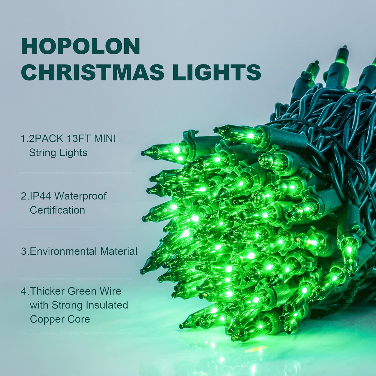 - π2Pack Incandescent Christmas Lights:Hopolon 2 PACK 50L Green Christmas mini lights is 13ft in total-Green wire with Bulbs: 3.5m/11.5ft, cord without lights50cm/1.5ft, spacing between every bulb: 7cm/2.76in. With Thicker green wire with strong insulated copper core, tangle-free to use,High quality UL certified products ensure the safety of you and your family.