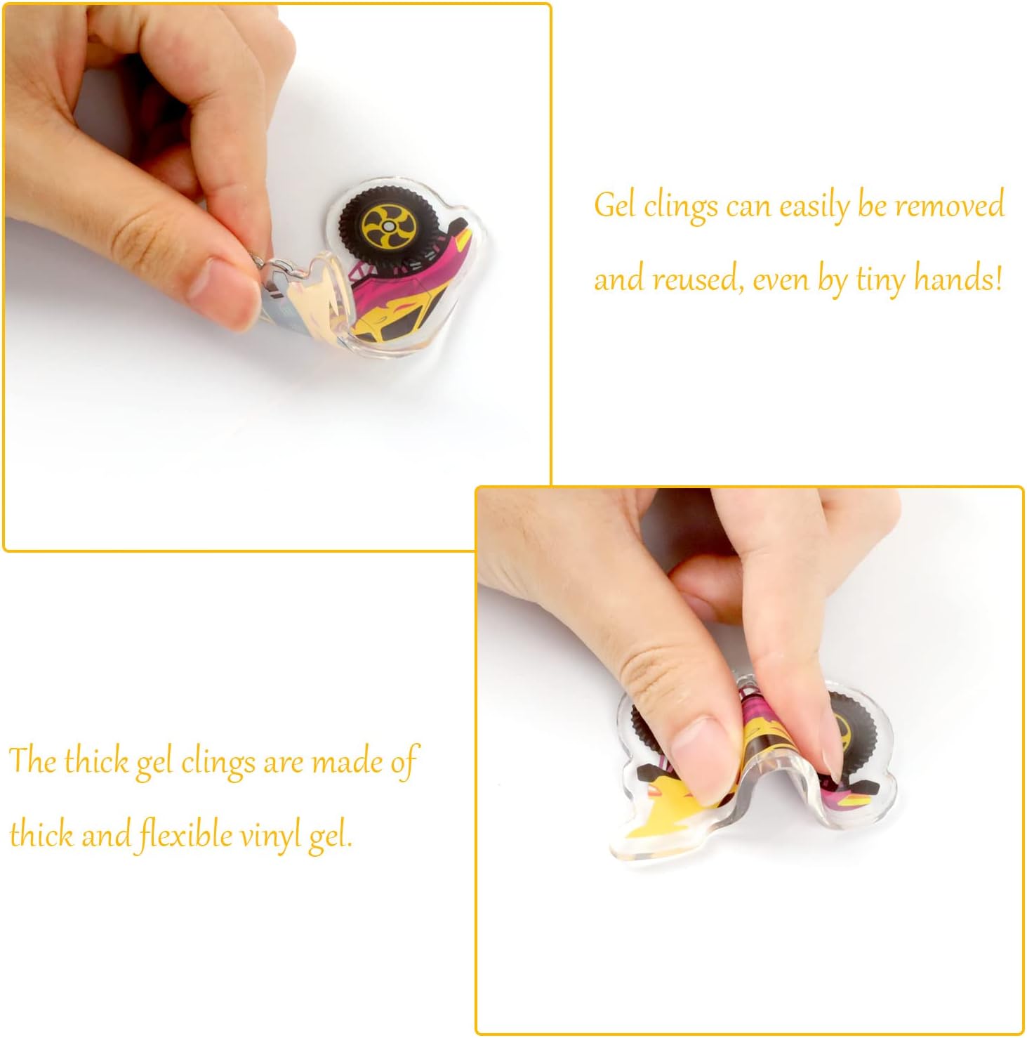 - Easy to use: just peel off the truck thick gel clings from the plastic backing, then place it on any surface you want; if you want to rearrange it, just tear it off and move it.