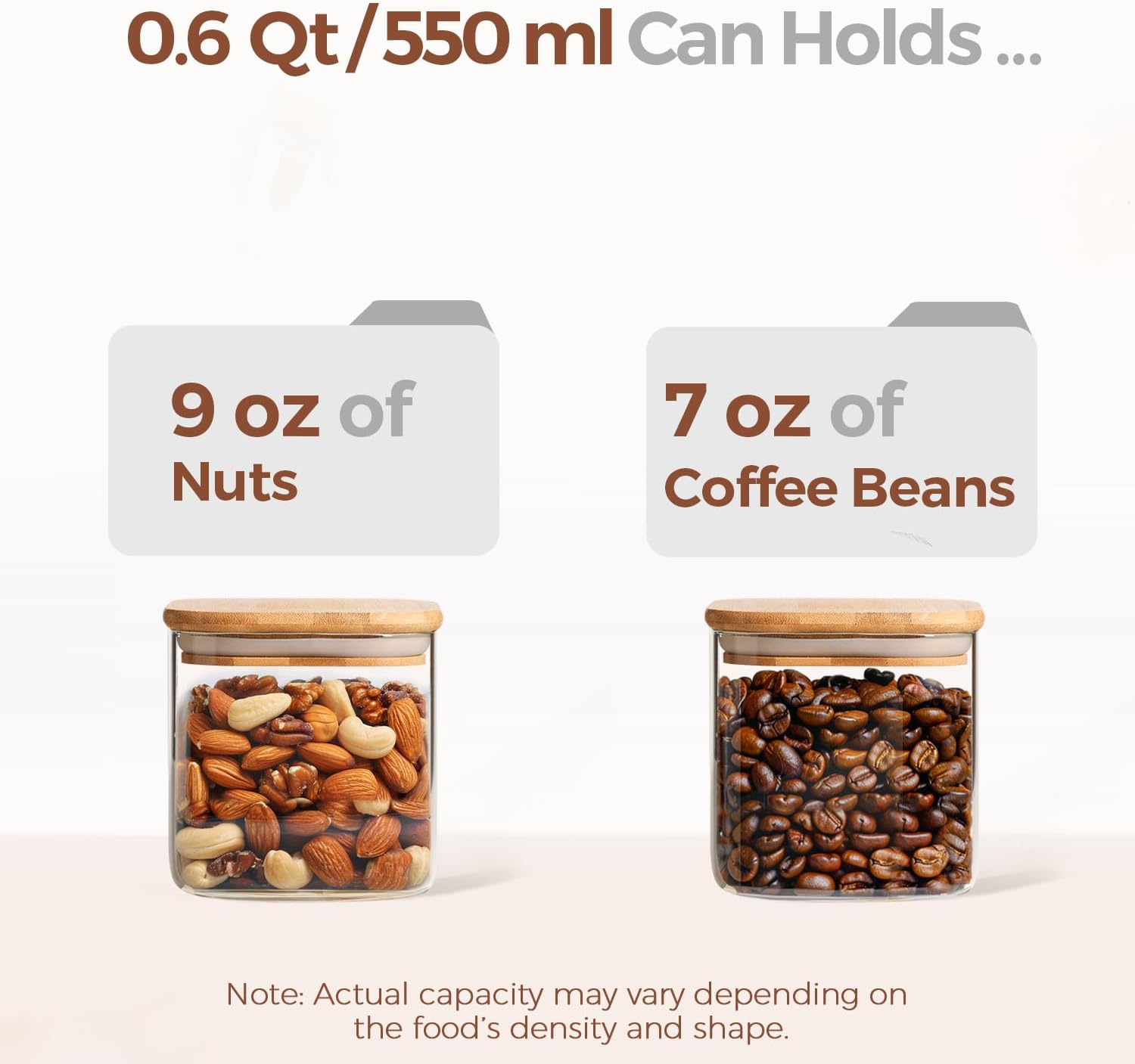 ComSaf 0.6 Qt Glass Food Storage Jars Set of 6, Clear Storage Containers with Airtight Lids, Pantry Organization Jar, Spice Jar, Blooming Tea, Coffee and Sugar Container, Canister Set for Kitchen