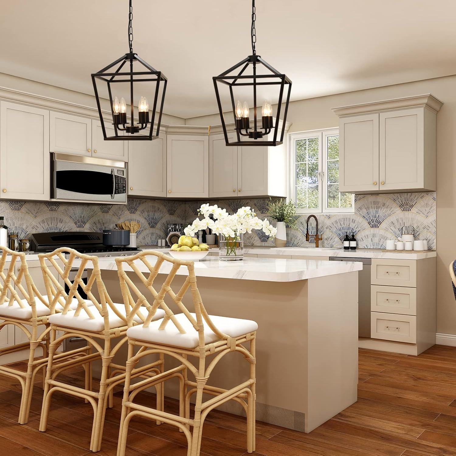 - 【Application】The Lantern chandelier dimension is 12"×12"×15",chain length:39.4",the chandelier light chain height is adjustable, and it can be installed on sloped or flat ceilings.
