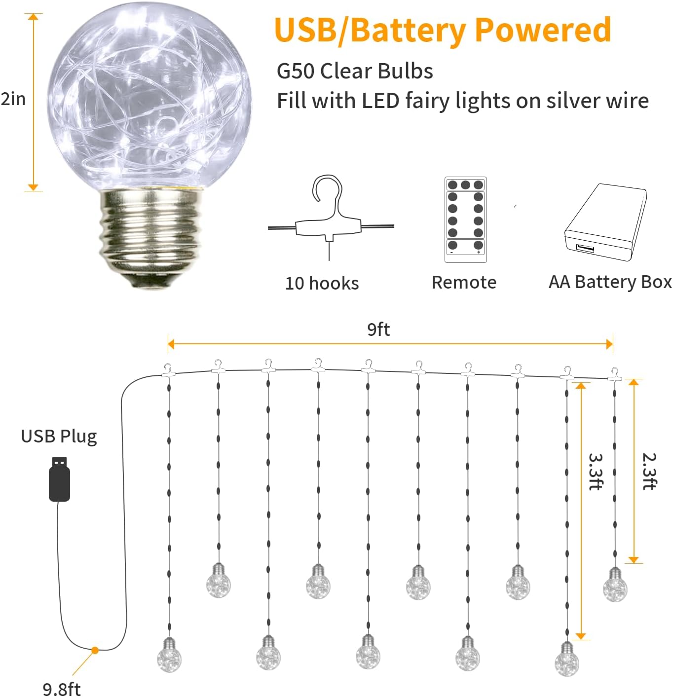 - Dual Power Options: The wishing ball lights features 5V low voltage operation. It features a 9.8ft USB plug cord to reach the USB device, and a AA battery box for battery power if there's no outlet nearby. It's easy and portable to illuminate the curtain lights. (AA batteries are not included)