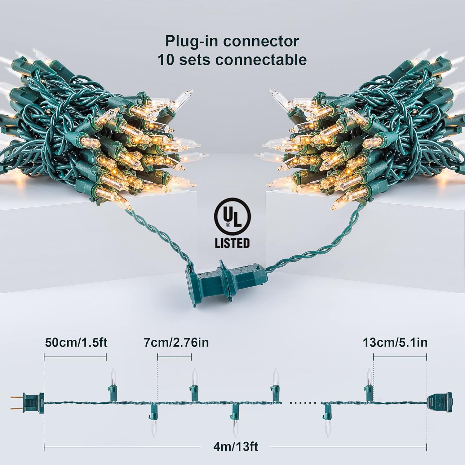 - 🌲Connectable Christmas Lights: Warm white string lights can be End-to-End connected. Up to 10 sets,lighting range can be extended to 130ft. With this convenient function,you can do the DIY decoration on any occasions: shopping street, Christmas, Halloween, music festival, birthday party, graduation party, garden, deck, bedroom.