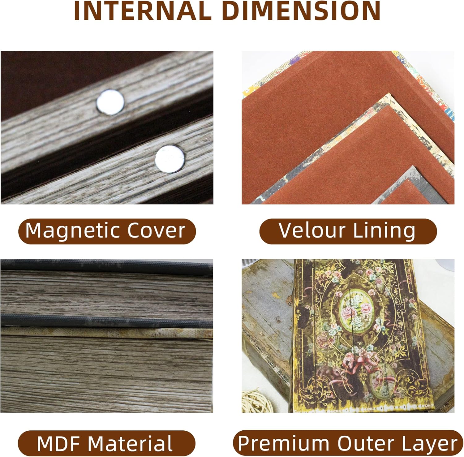 - The inside of this book box has a delicate plush lining and comes in two sizes, ideal for storing items of different sizes, such as jewelry, glasses, photos, letters, Christmas card etc