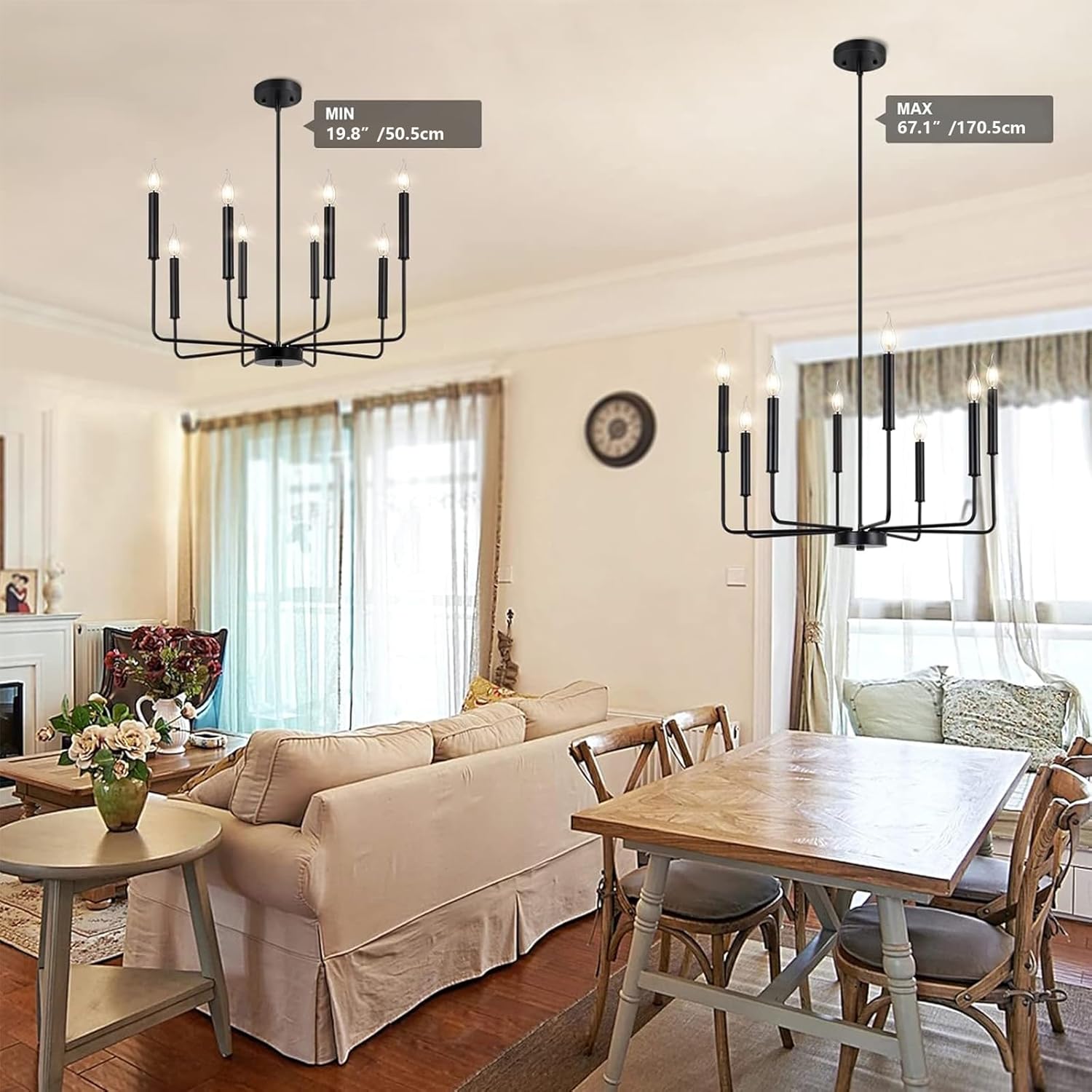 - Modern Fashion Design: A classy candelabra chandelier with different lengths of arms and black matte finish which allows you to clean easily. The appearance of 8 uneven arms look genuine and novel. The whole minimalist design is classic but not rigid. With this simple and retro look can upgrade your space that is elegant but generous