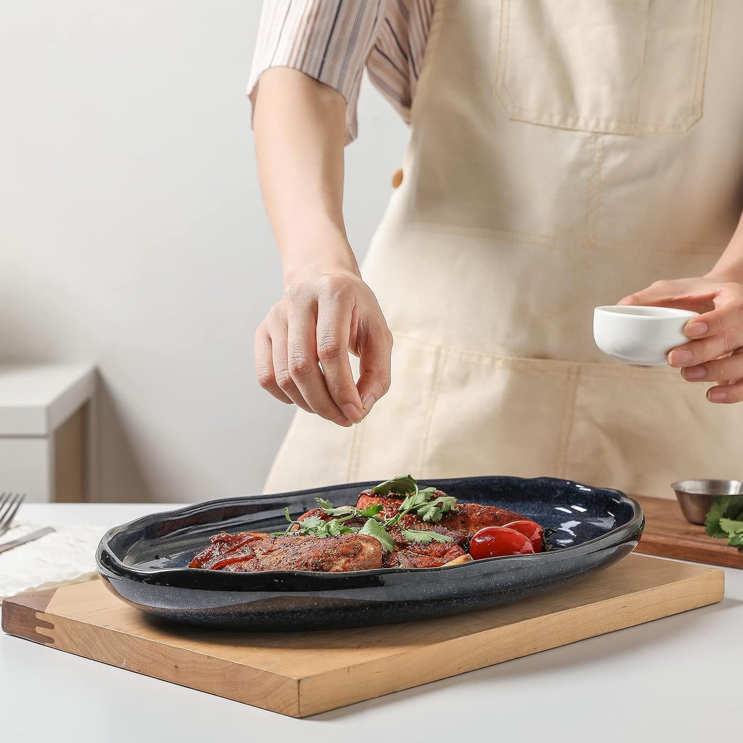- LARGE LONG PLATTER: Our oval serving plates are 14.5 Inch long and easily stackable, the oversized fancy serving dishes are elegant and perfect for serving meat, turkey, roast chicken, steak, fish, sushi, dessert, fruit, salad and bread