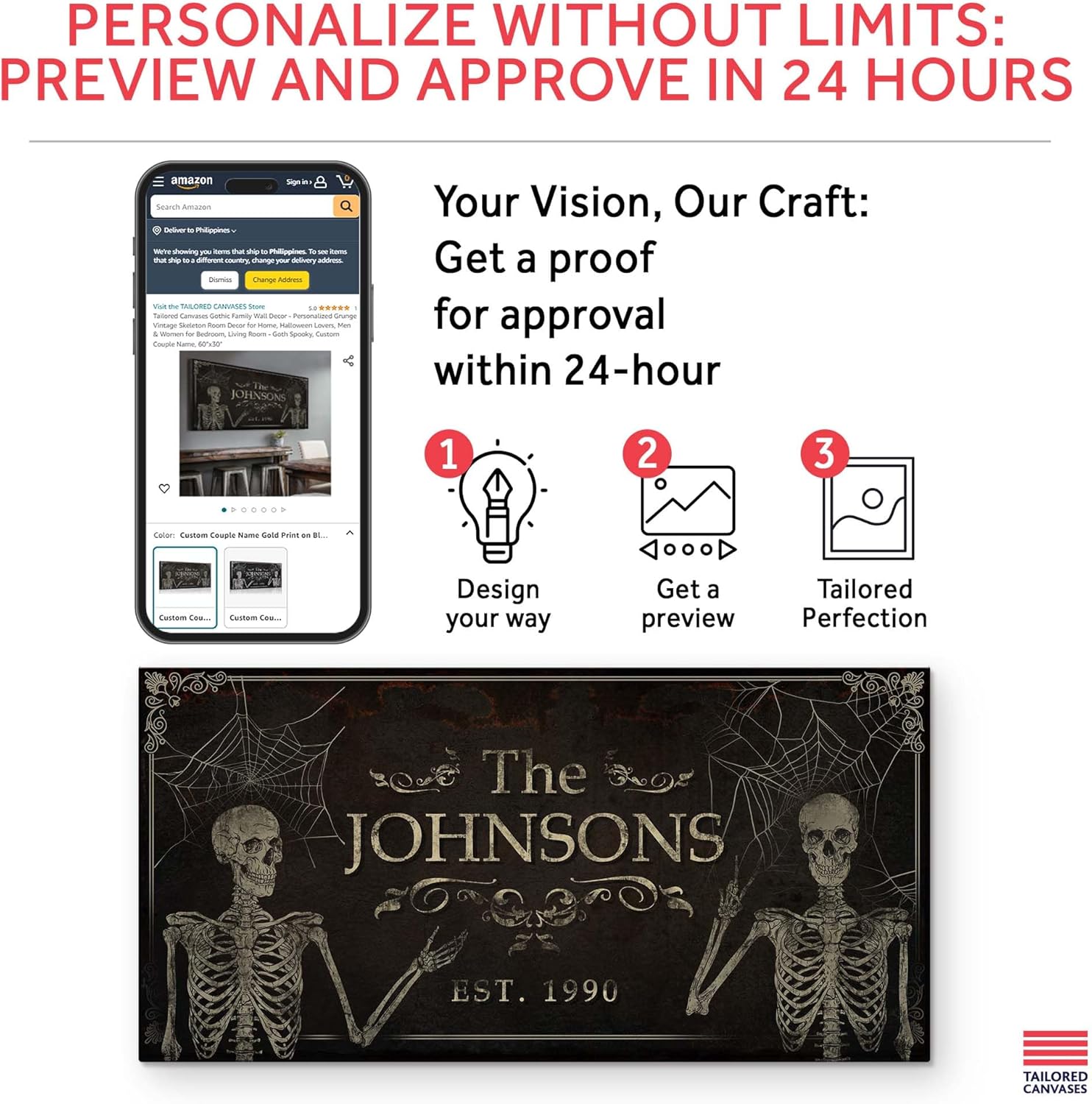 Tailored Canvases Gothic Family Wall Decor - Personalized Grunge Vintage Skeleton Room Decor for Home, Halloween Lovers, Men & Women for Bedroom, Living Room - Goth Spooky, Custom Couple Name, 60"x30"