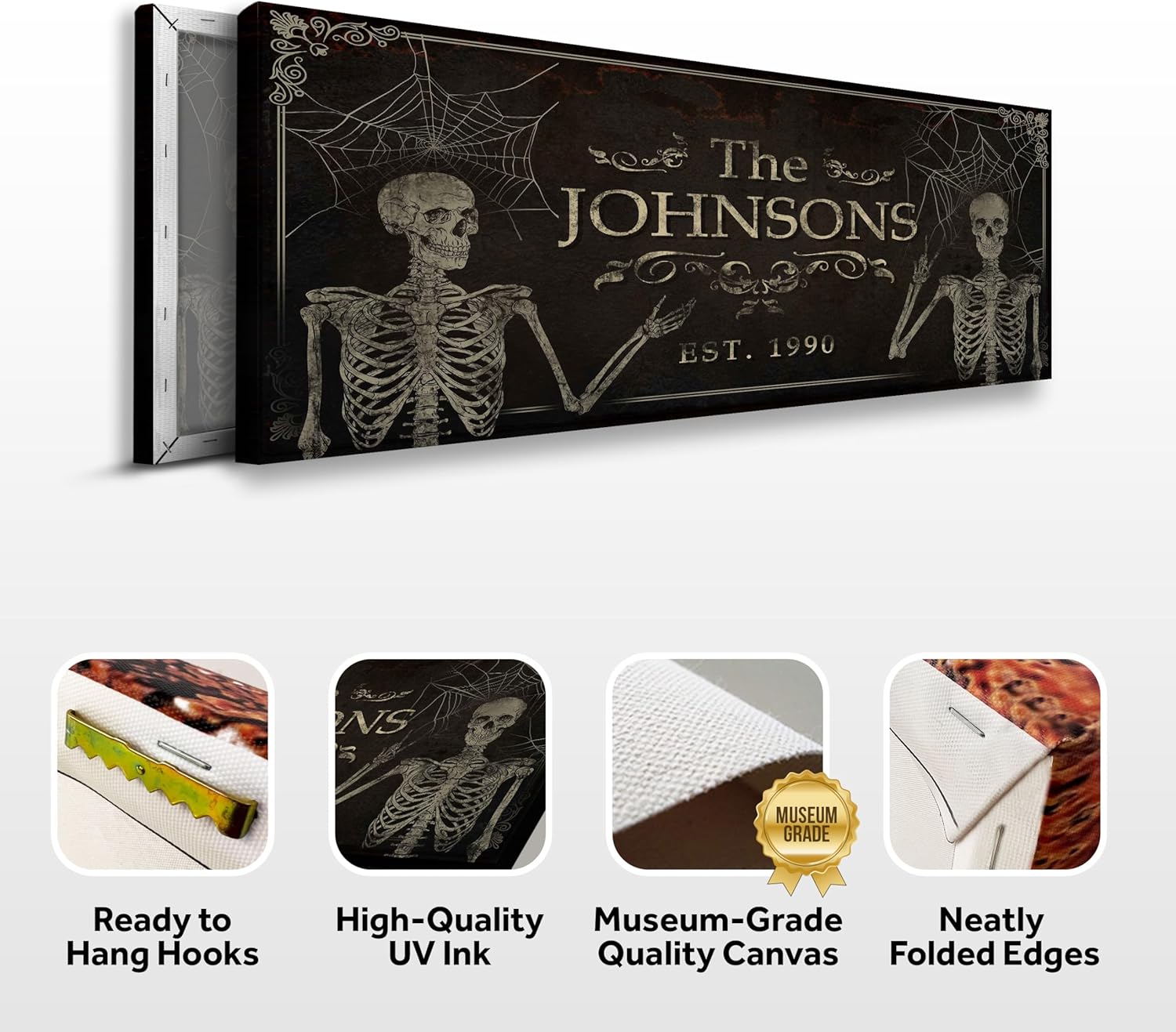 - Museum-Grade Quality -Premium Gallery-Wrapped Canvas Gothic Family Sign Wall Art; No sagging, dents, accidental rips; Printed using UV-Resistant Ink with a neatly folded edge to complete that Spooky Gothic Décor look!
