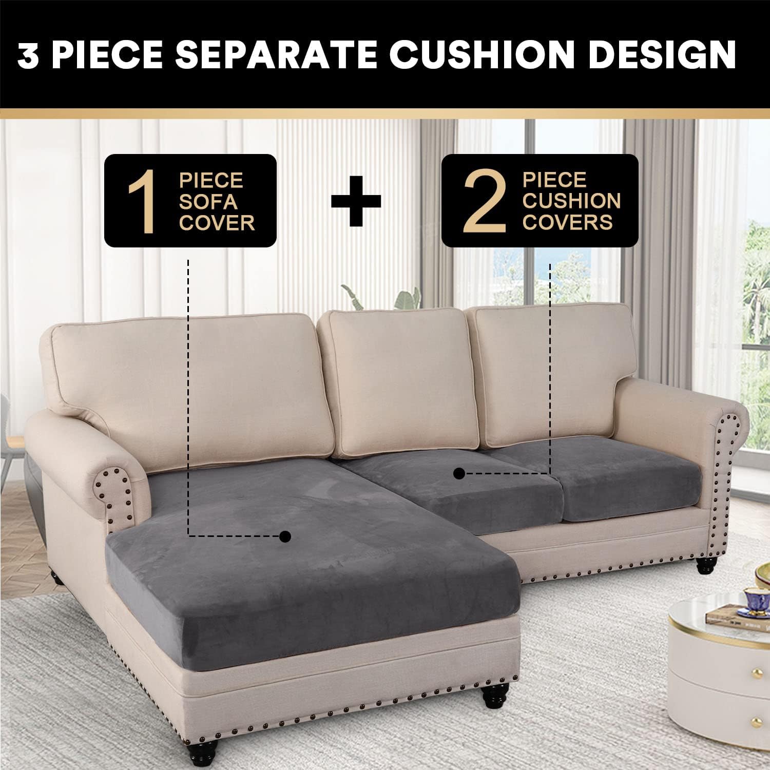 PrinceDeco Sectional Couch Covers 3 Pieces Velvet Sofa Covers L Shape Soft Couch Covers for Sectional Sofa Corner Sofa Cover Couch Cover for Dogs Washable (2 Seater + 1 Chaise,Grey)