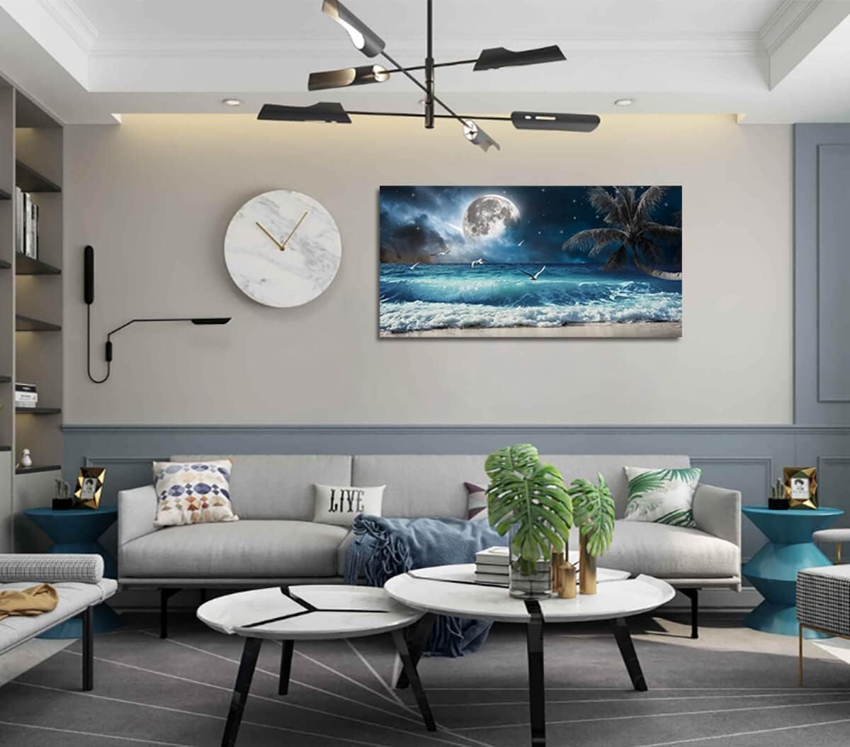 Yxbhhym large Moon Ocean Wall Art Seascape Painting Sea Pictures Canvas Wave Blue Beach Artwork for Wall Landscape Poster Prints Palm Wall Decor Bedroom Living Room Decor Framed-24x48inches