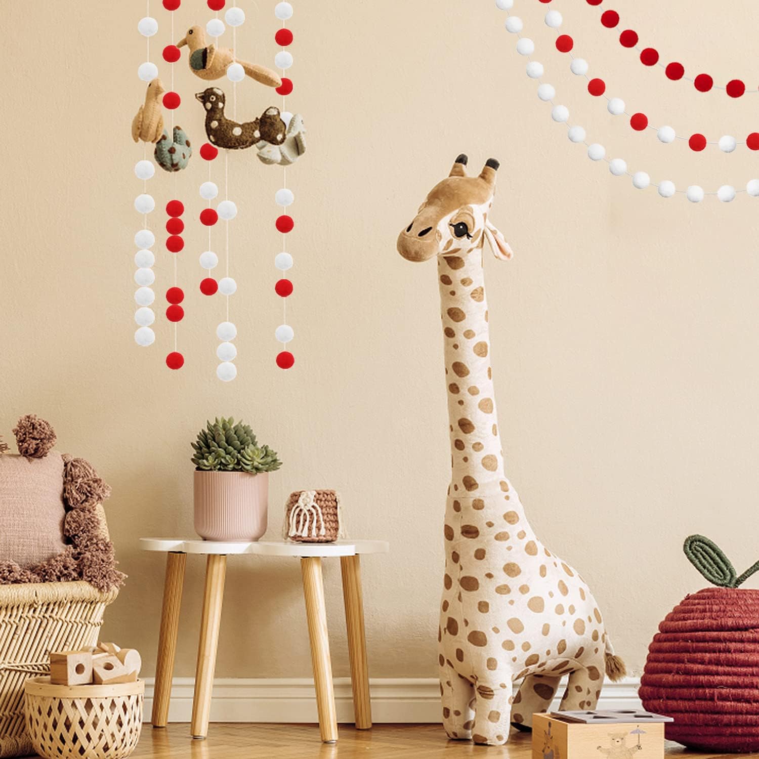 - CHRISTMAS DECORATIONS INDOOR HOME DECOR & MORE OCCASIONS: Vintage modern style cute kawaii lovely special design, adding a warm rustic feel. Easy to hang and can be hung anywhere, perfect funky eclectic decor for home, office, kids playroom, students classroom. Red color felt balls are like little small red berries, so it's a great decorations for indoor home, outdoor yard garden, Xmas tree, living room, bedroom, stair railing, fireplace mantel, mantle, ceiling, wall, door, window, gift basket.