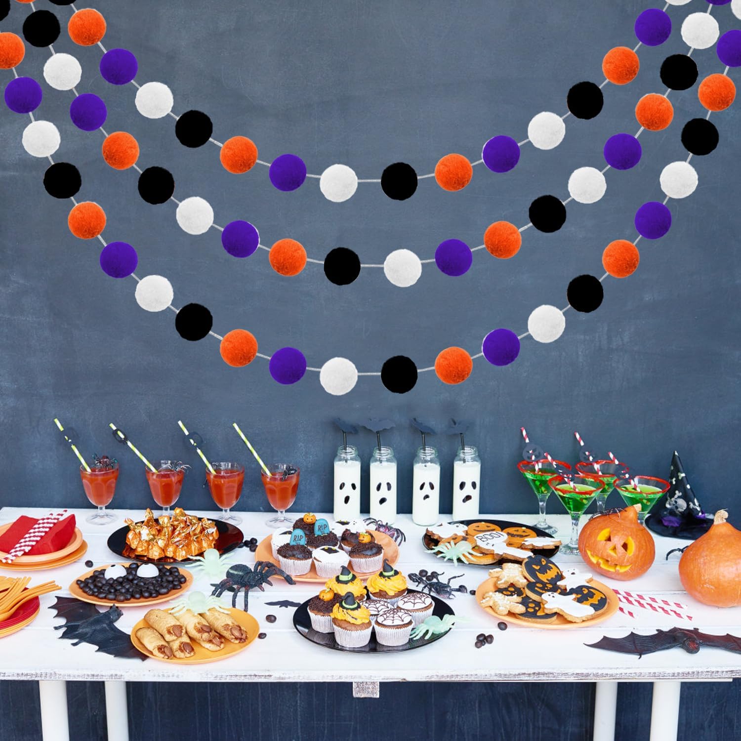 Jishi Fall Event Garlands, 3pk Orange Black White Felt Pom Pom Garland, 6.6ft Long, 25mm 24 Balls, Halloween Thanksgiving Party Decor
