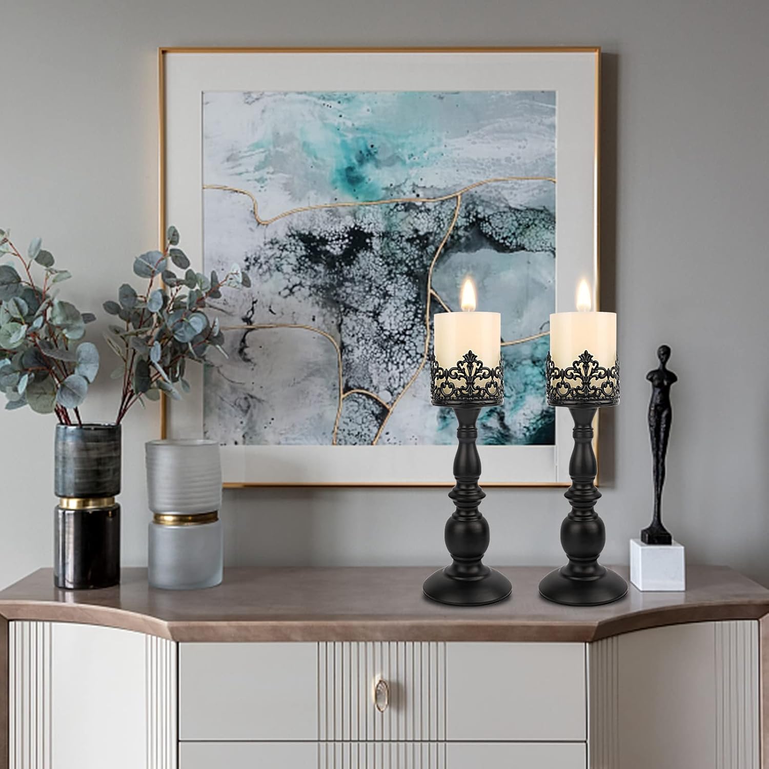 Candle Holders for Pillar Candles Gothic Matte Black Vintage Tall Candle Holders Set of 2 Decorative Large Table Centerpieces Candle Stand Decor (Black 2PCS A)