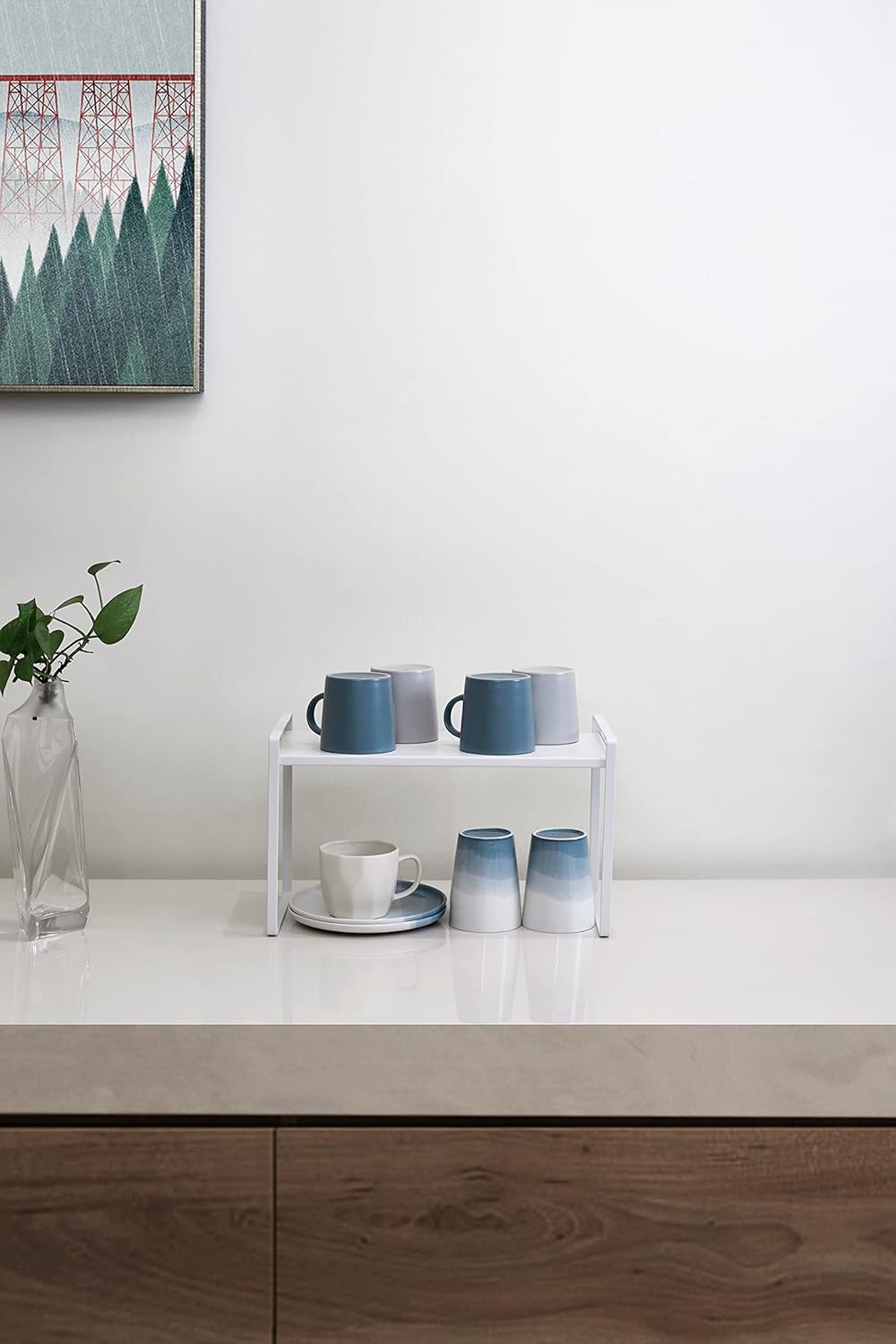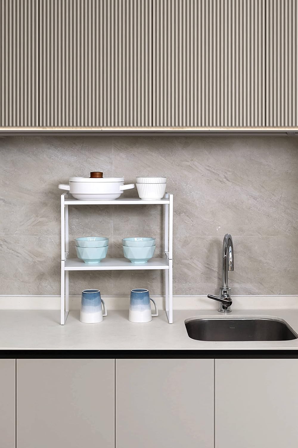 - CHARACTER DESIGN: This cabinet shelf can create plenty of space for your household items such as cups, pots, bottles, bowls, cookware, or canned foods without dominating space in your cabinet. This stylish cabinet shelf fits neatly on the countertop to keep your essentials organized and easily accessible.