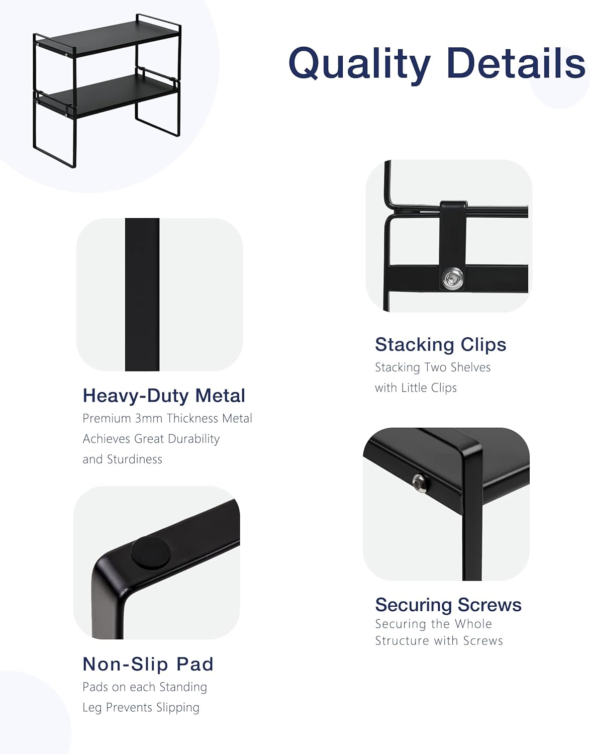 - CHARACTER DESIGN: This cabinet shelf can create plenty of space for your household items such as cups, pots, bottles, bowls, cookware, or canned foods without dominating space in your cabinet. This stylish cabinet shelf fits neatly on the countertop to keep your essentials organized and easily accessible.