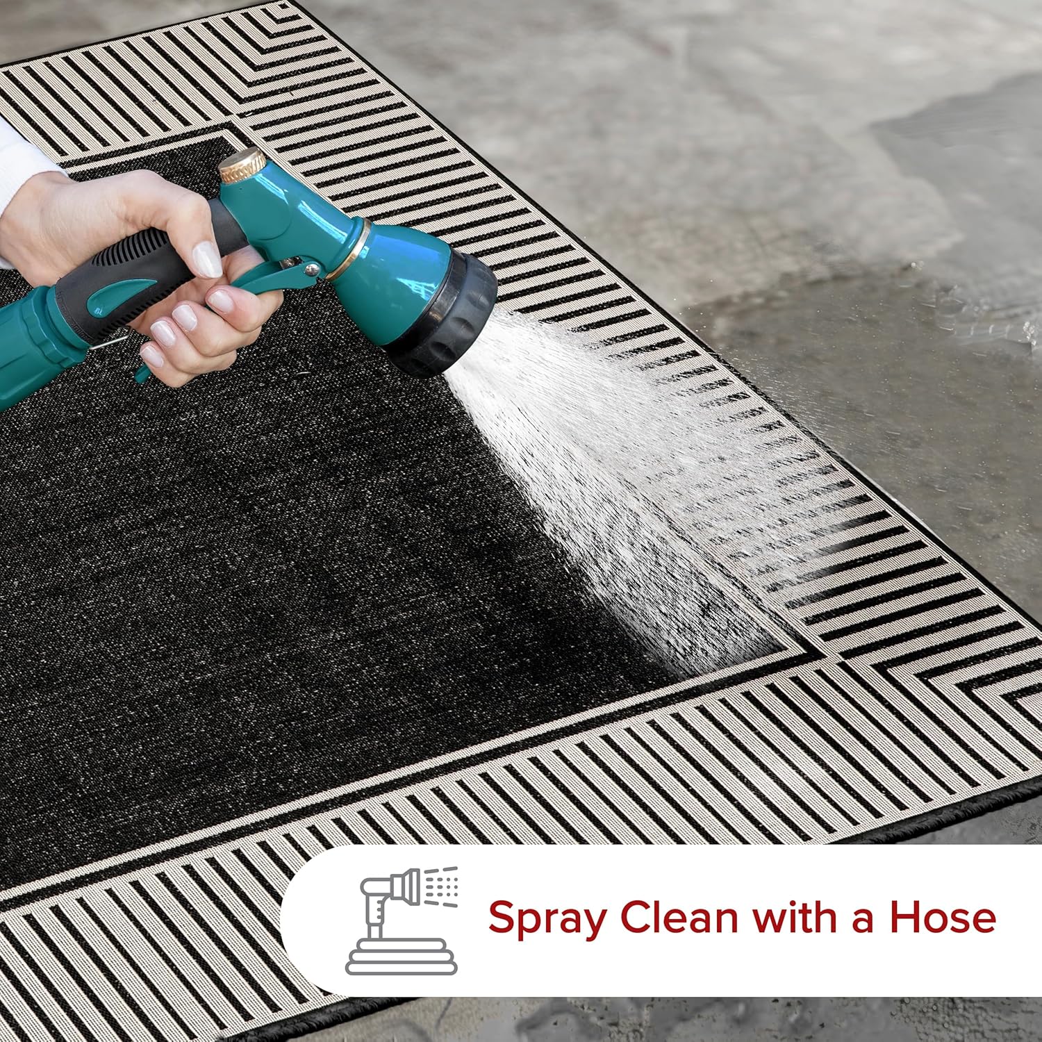 nuLOOM 5' x 8' Outdoor Area Rug, Casual Design With Striped Border, Stain Resistant, Highly Durable, For Patio, Balcony, Bedroom, Living Room, Dining Room, Bathroom, Black