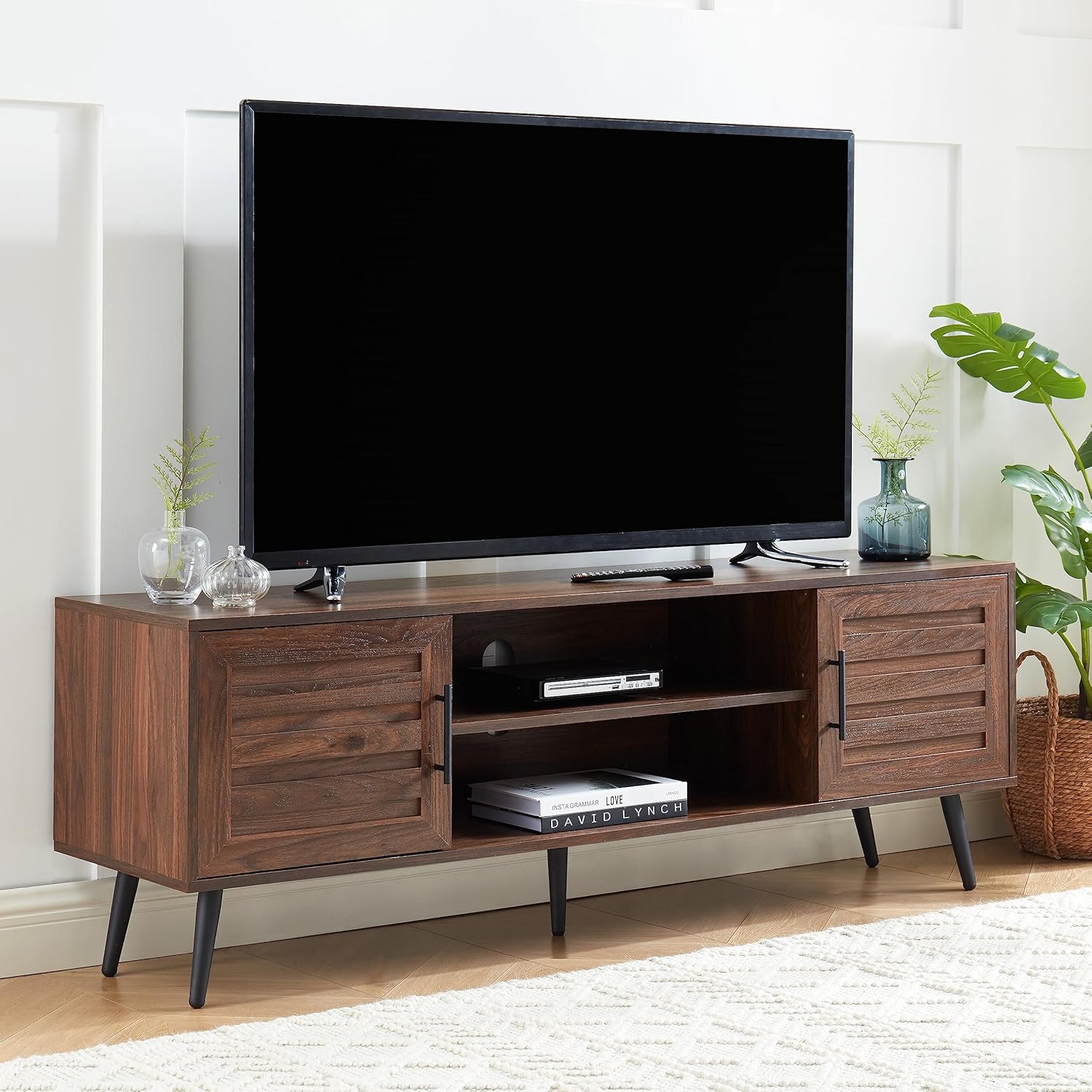 Mid Century Wooden TV Stand Entertainment Console with Open Shelving and 2 Cabinets for Televisions up to 65 Inches(Dark Walnut)