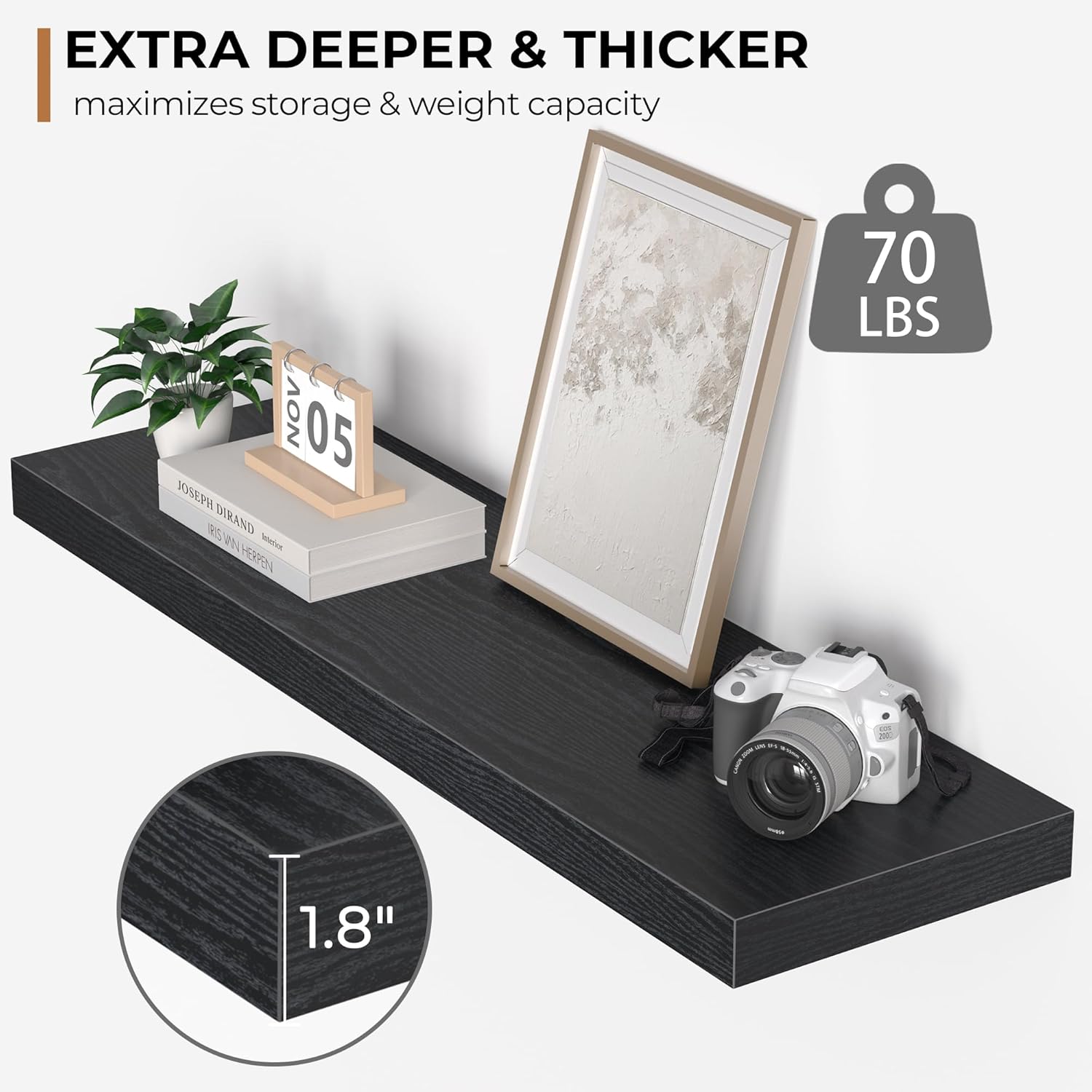 - Extra Deeper & Thicker - This wall shelf measures 36"W x 10.23"D x 1.8"H. Extra deeper and thicker design in order to bring maximizes storage space and weight capacity, even hold up to 70 lb. This floating shelf taking up zero square feet, reduces clutter and highlights dรฉcor in compact spaces.