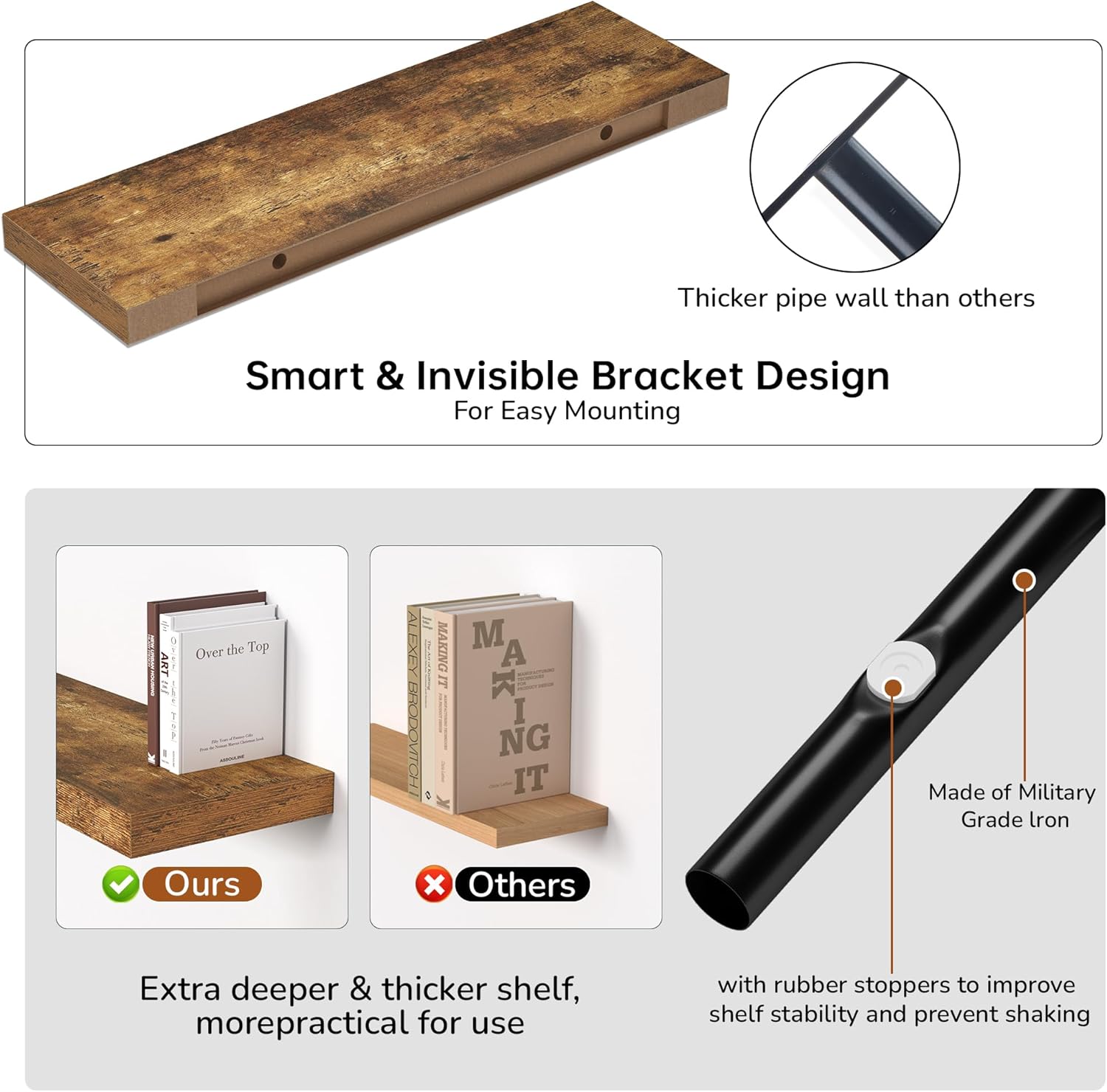 - Extra Deeper & Thicker - This wall shelf measures 36"W x 10.23"D x 1.8"H. Extra deeper and thicker design in order to bring maximizes storage space and weight capacity, even hold up to 70 lb. This floating shelf taking up zero square feet, reduces clutter and highlights dรฉcor in compact spaces.