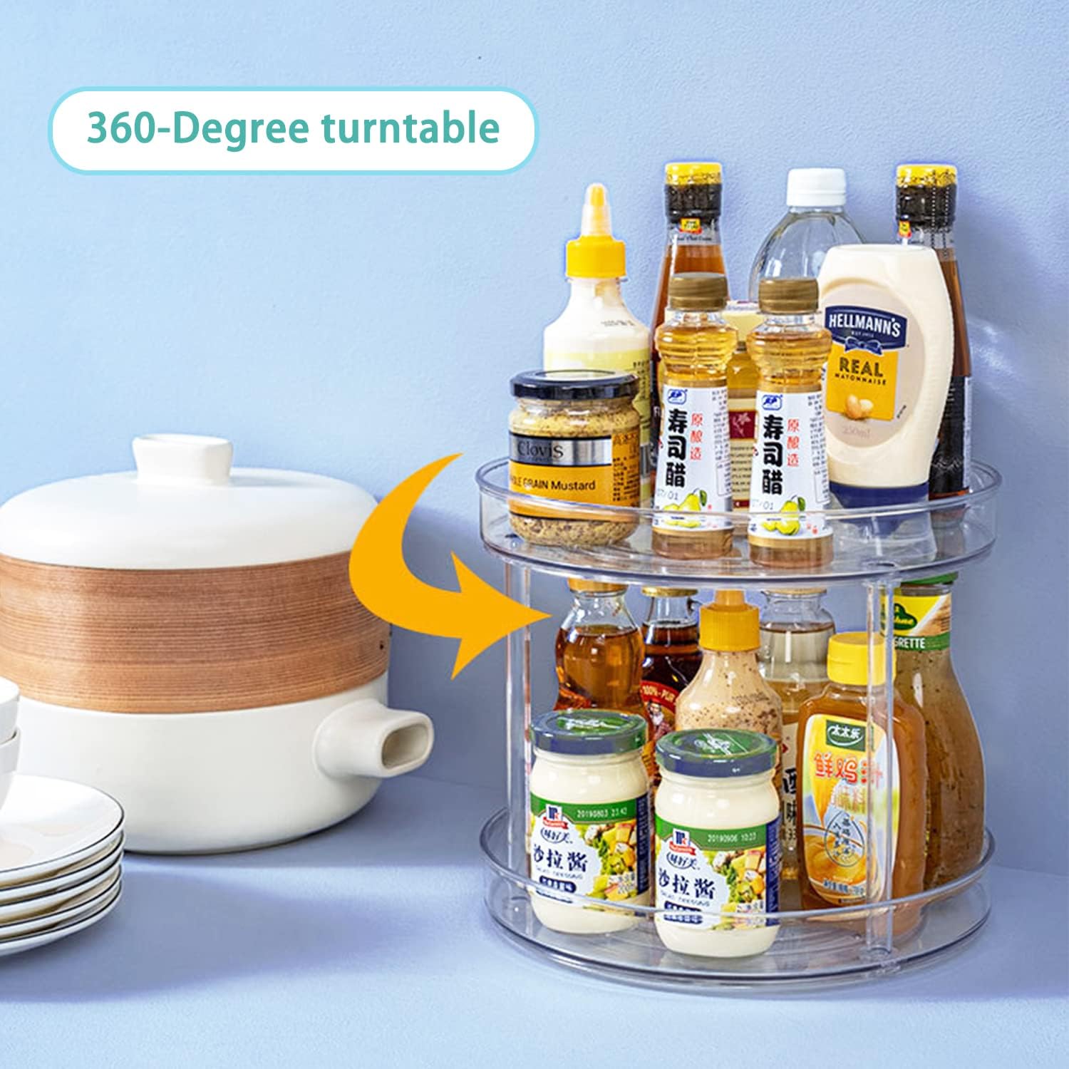 - Premium & Secure: The 2 tier lazy susan organizer is made of durable BPA-free plastic for years of quality use. It is more durable and does not require frequent replacement. Perfect clear turntable organizer for pantry organization and storage. Clean it with mild soap and water, do not place in dishwasher.