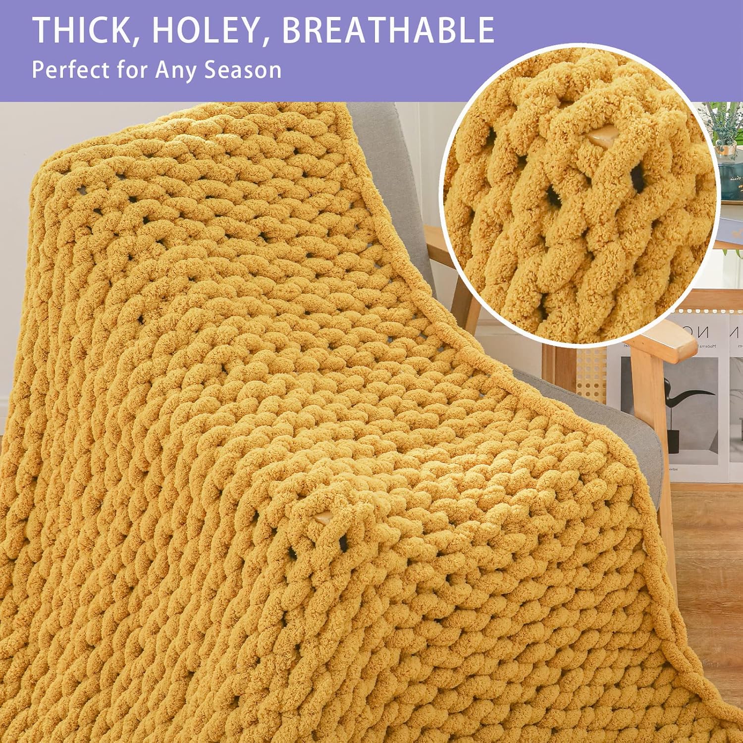 Bigacogo Chunky Knit Throw Blanket for Couch, 40x80 inches, 100% Hand Knitted with Thick Jumbo Chenille Yarn, Cozy Soft Large Rope Knot Cable Crochet Blankets for Sofa Bed Living Room, Mustard Yellow