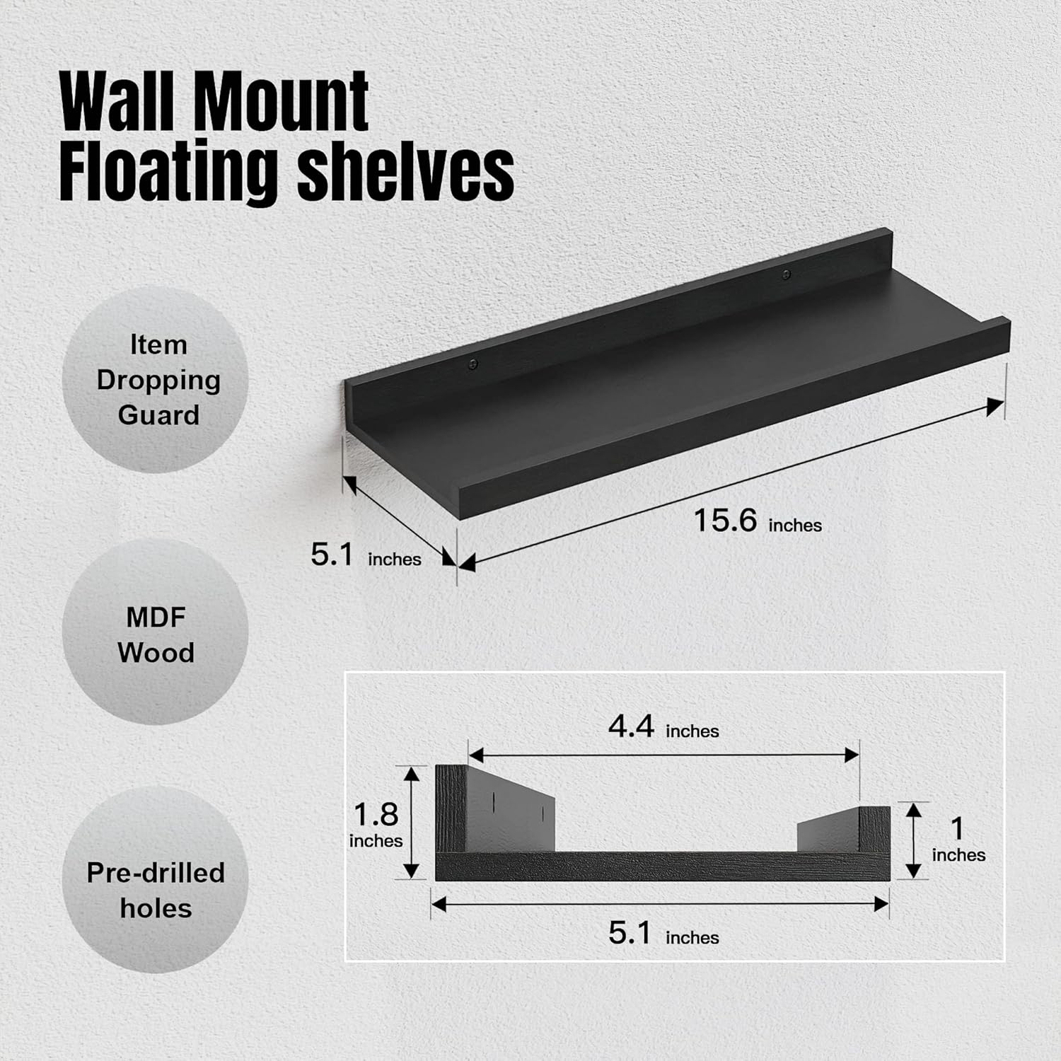 RICHER HOUSE 5 Set Floating Wall Mounted Shelves, Black Shelves for Wall Decor, Modern Picture Ledge Shelf with Lip for Storage, Nursery, Bedroom, Living Room, Bathroom - Black