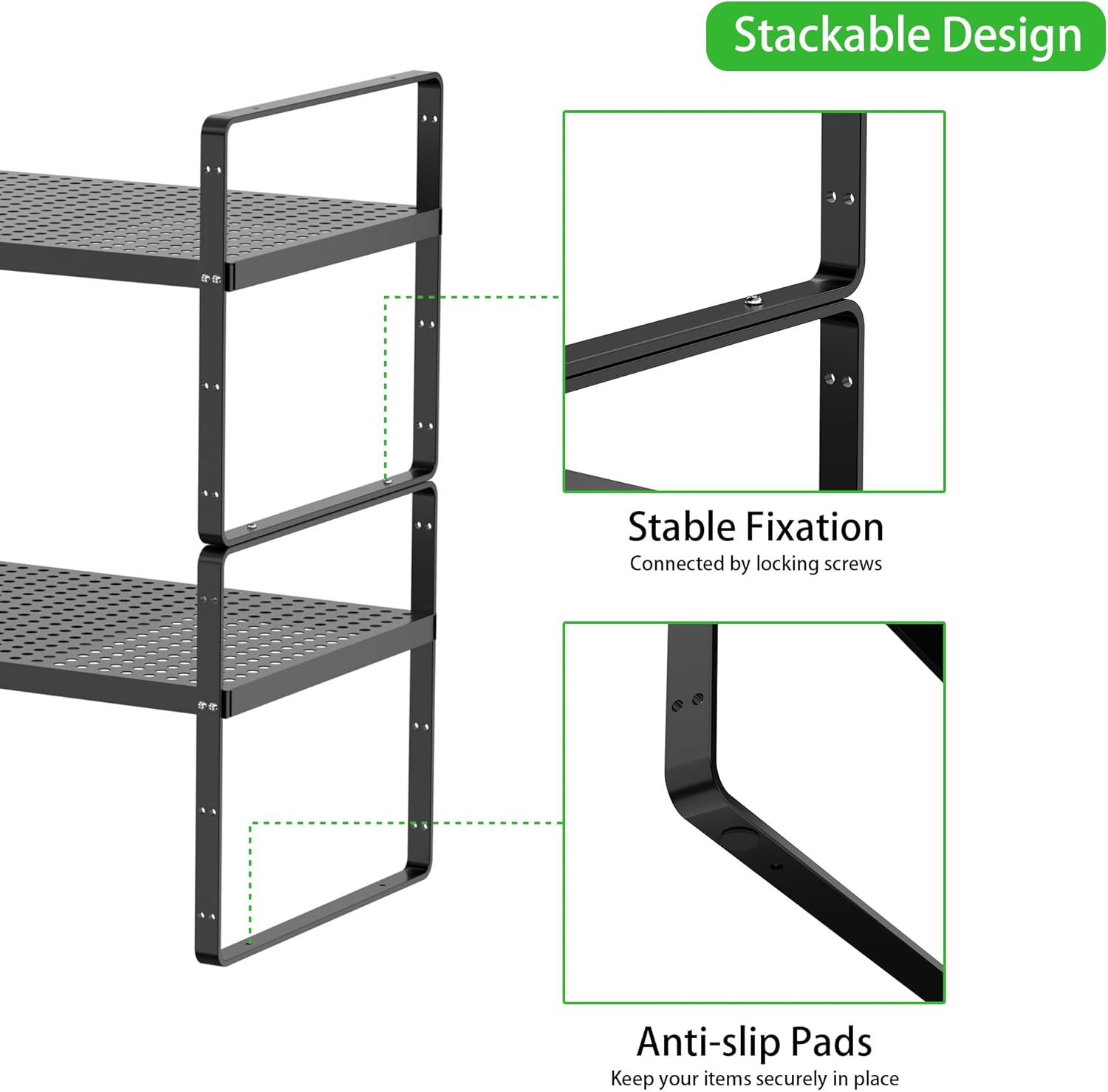 - Stackable Shelves: You can stack one shelf on top of another to creat multiple levels of storage space. You can choose 1, 2 or 3 tier shelving unit to meet your needs. The shelf stand is perfect for kitchen cabinets, pantries, countertops, under the sink or anywhere you need extra space to maximize storage and organization.
