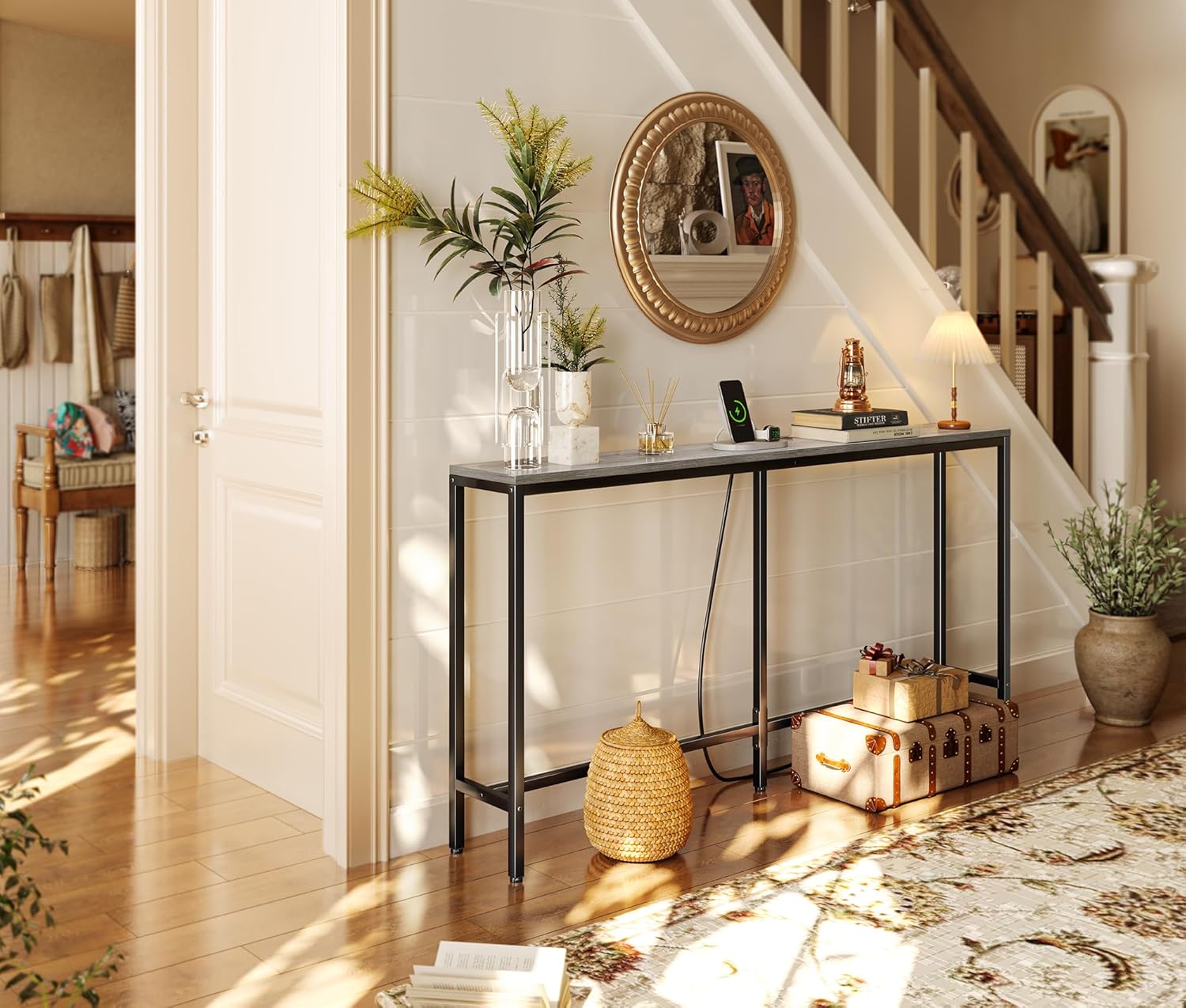 SUPERJARE Console Table with Outlet, 63 Inch Sofa Table with Charging Station, Narrow Hallway Entryway Table, Behind Couch Table Skinny for Entryway, Living Room, Plants, Charcoal Gray