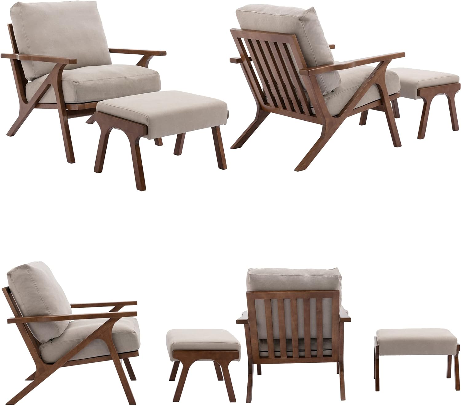 Mid Century Modern Accent Chair with Ottoman, Farmhouse Linen Upholstered Living Room Armchair and Ottoman Set, 23" Seat Wide Retro Leisure Lounge Chair with Wood Frame for Home, Bedroom, Beige