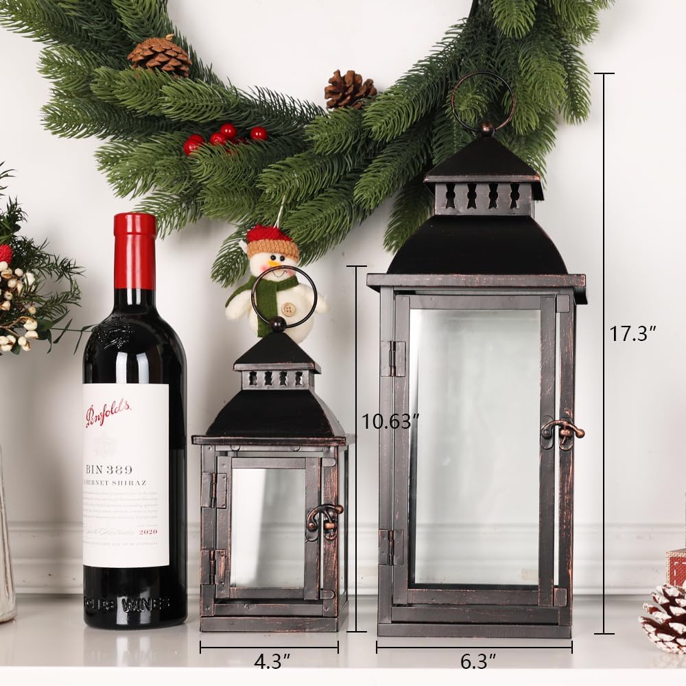 NEEDOMO Lanterns Decorative Outdoor&Indoor, Set of 2 Large Bronze Metal Lantern Decor with Glass, Candle Holder for Porch, Patio, Garden, Balcony, Wedding, Table Centerpiece Decorations