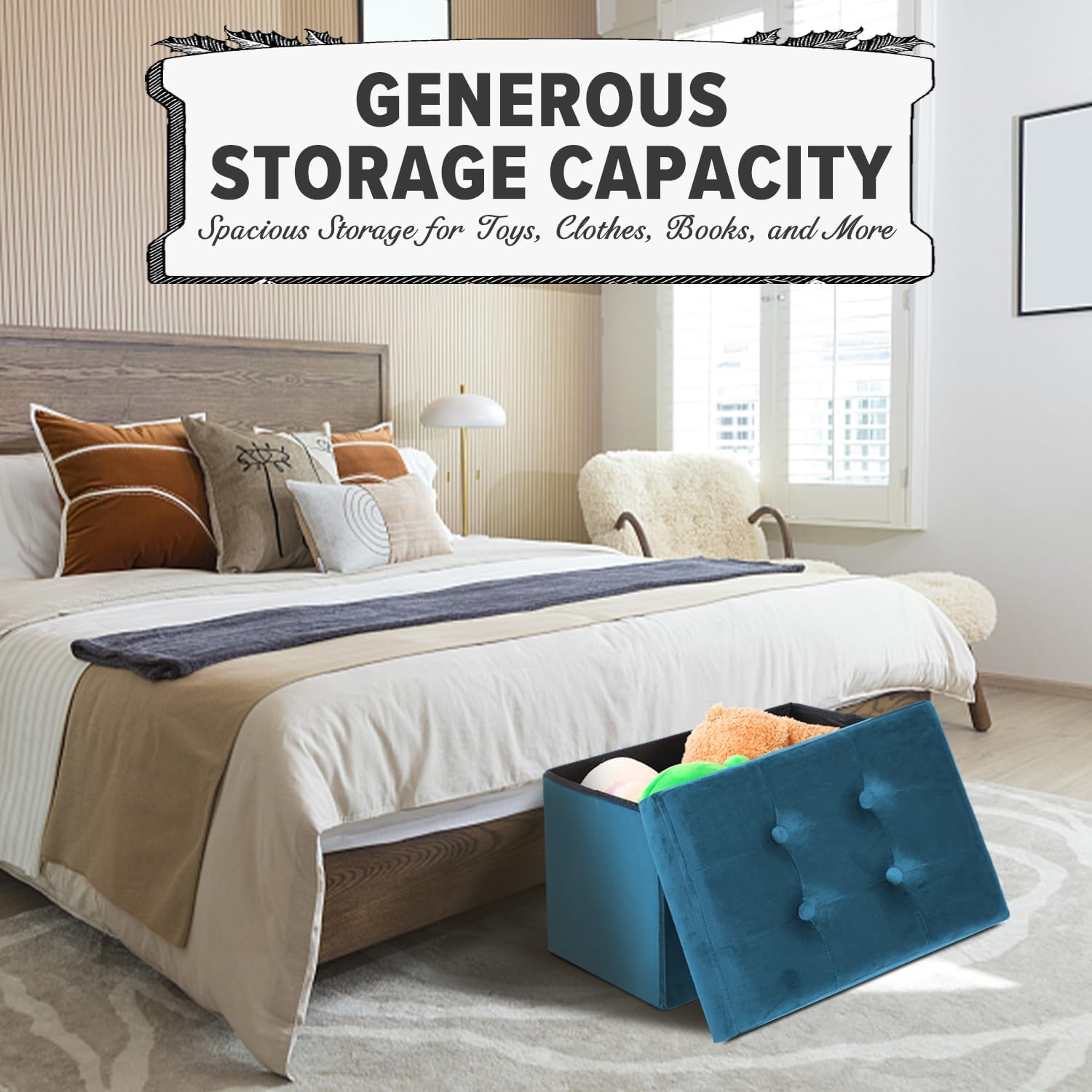 - 【Large Storage Space】 It is made of high quality fiberboard frame, so you can sit on it with confidence. It's perfect for your bedroom or living room. Whether used as a under desk foot rest or as living room storage, this ottoman foot rest provides maximum comfort. The velvet folding footstool serves as a ottoman with storage for living room to store Christmas gifts, blankets, cushions, books and sports equipment. It helps to keep the room organized and neatly hide clutter