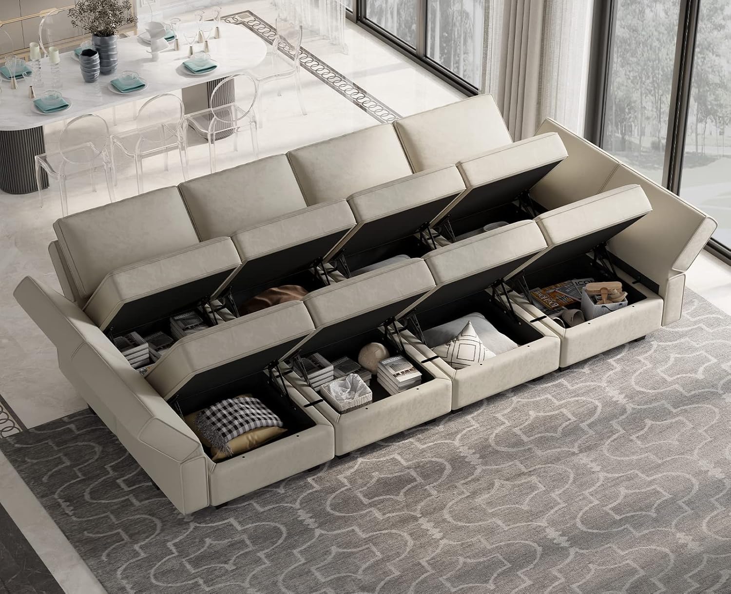 - Large Capacity Storage Space: The storage spaces of modular sofa are under each 8 seats for blankets or other things that you want to store at hand. The storage can be opened widely and you can easily pick out and put in the things. Storage dimensions: 22.40''(L)*22.40''(W)"*5.70"(H).