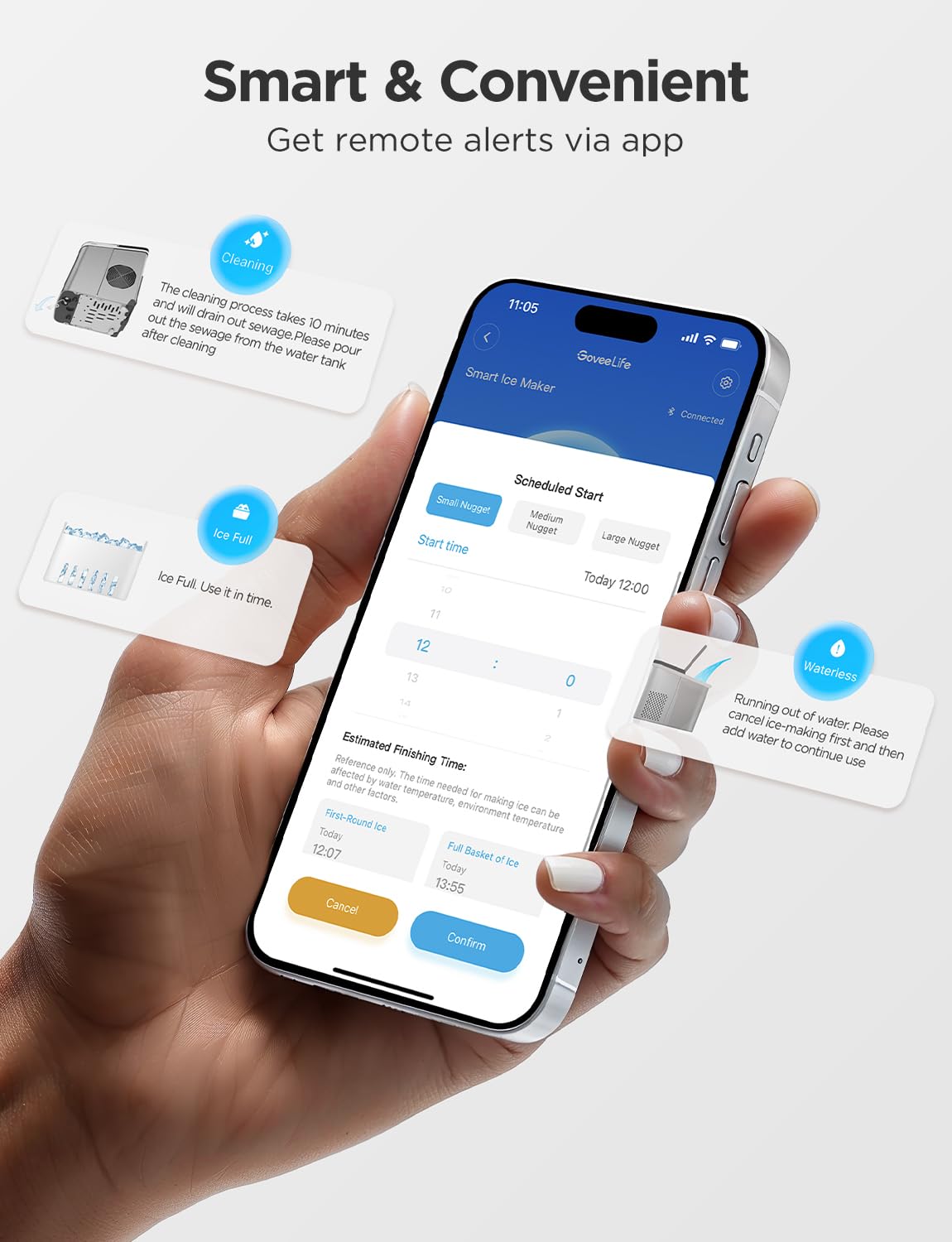 - App Alerts & Scheduling: GoveeLife Ice Maker comes equipped with advanced sensors that alert you via voice, panel, and app when the ice basket is full or the tank is short of water. Schedule ice production through the app to always meet your ice needs.