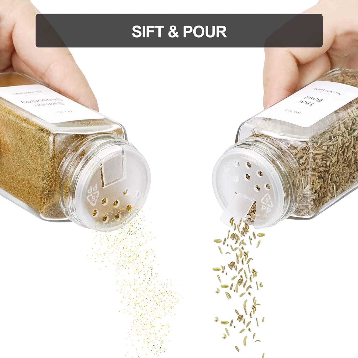 - 28 Glass Premium Spice Jars: Spice jars are made of lead-free glass, safe and shatter-resistance.28 dual functioning sift and pour lids; let you shake or use spoons to measure. The airtight aluminum caps protect prepared spices not exposed to air, keeping spices aromatic and flavorful.