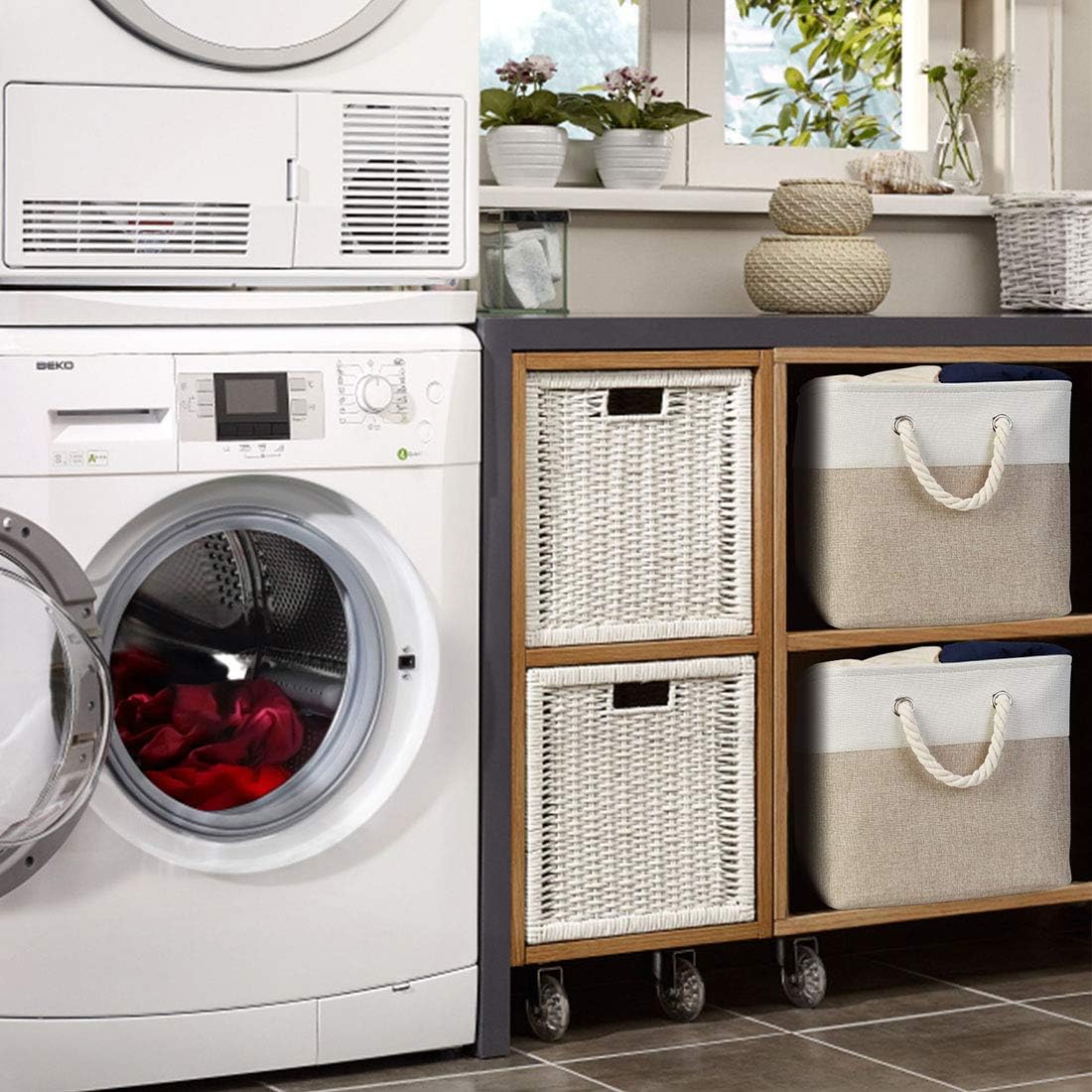 i BKGOO 3Pack Large Foldable Storage Bins,Collapsible Sturdy Cationic Fabric Organizing Storage Basket Cube with Cotton Handles for Home Office Shelf Clothes Toys White-Khaki 13×13×13 inch