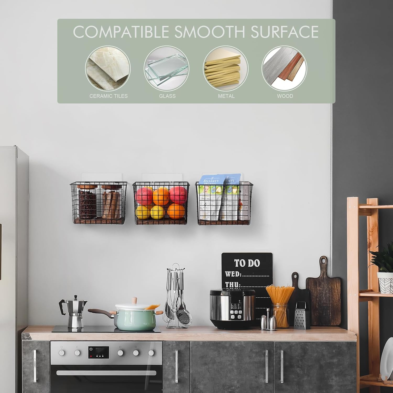 Wall Hanging Baskets 3 Pack, Large Diversified Wire Basket Shelves of Wooden Style, with Wall Mounted Metal Hooks & Traceless Stickers, for Kitchen Coffee Bar Office Room Garage Storage Organization