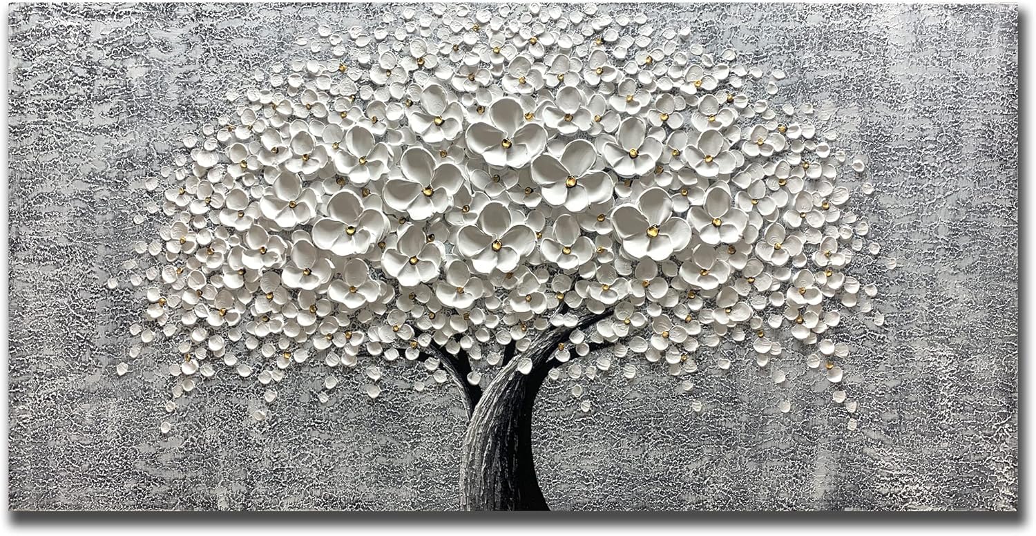 Yika Art - 24x48 Inch 3D White Flower Painting Abstract Textured Knife Platte Acrylic on Canvas 3D Flowers Tree Painting Ready to Hang