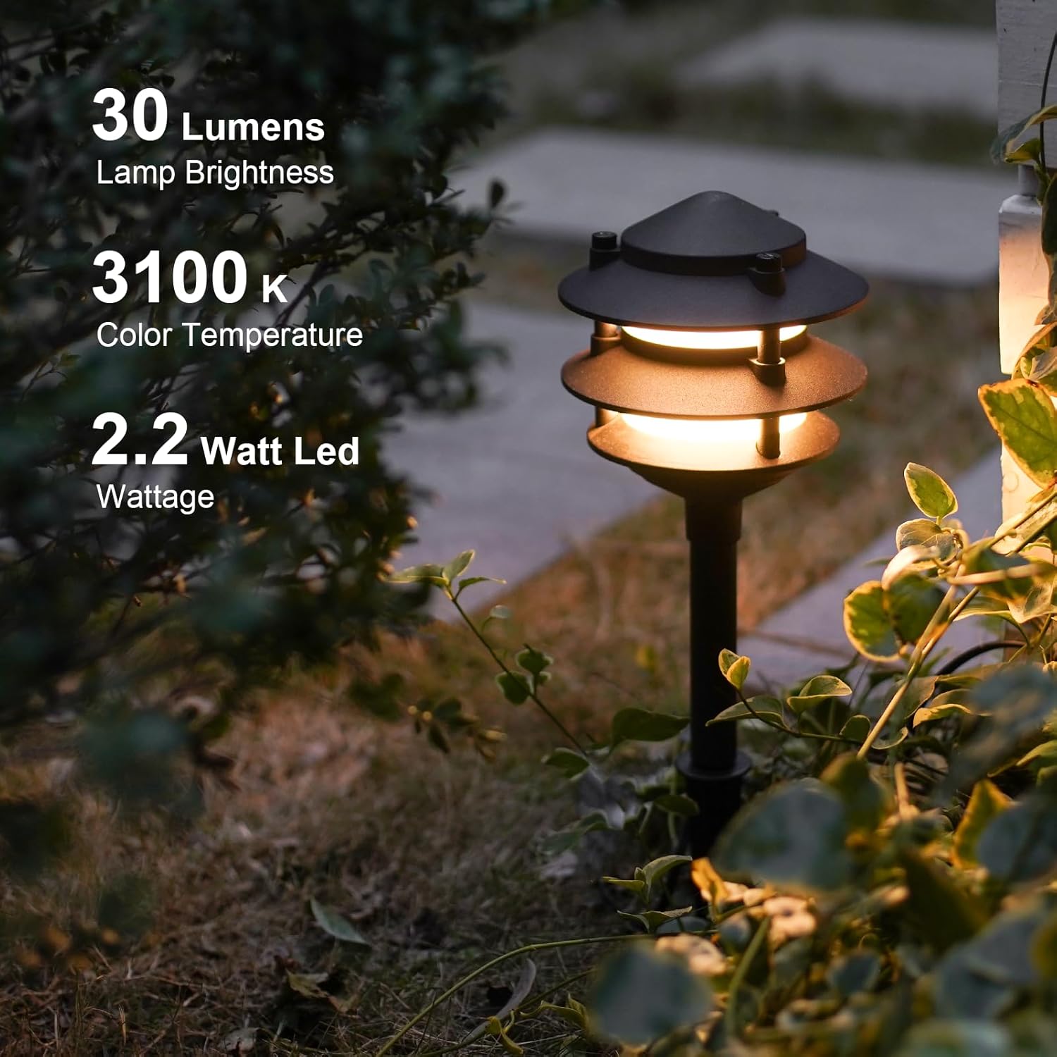 - ✔4PK 12V AC PATHWAY LIGHTS: These 4PK low voltage path lights use 2.2 watt led chips with 30 lumen brightness. You will like the 3 tier pagoda shape, a refreshing option from other shaped landscape lights