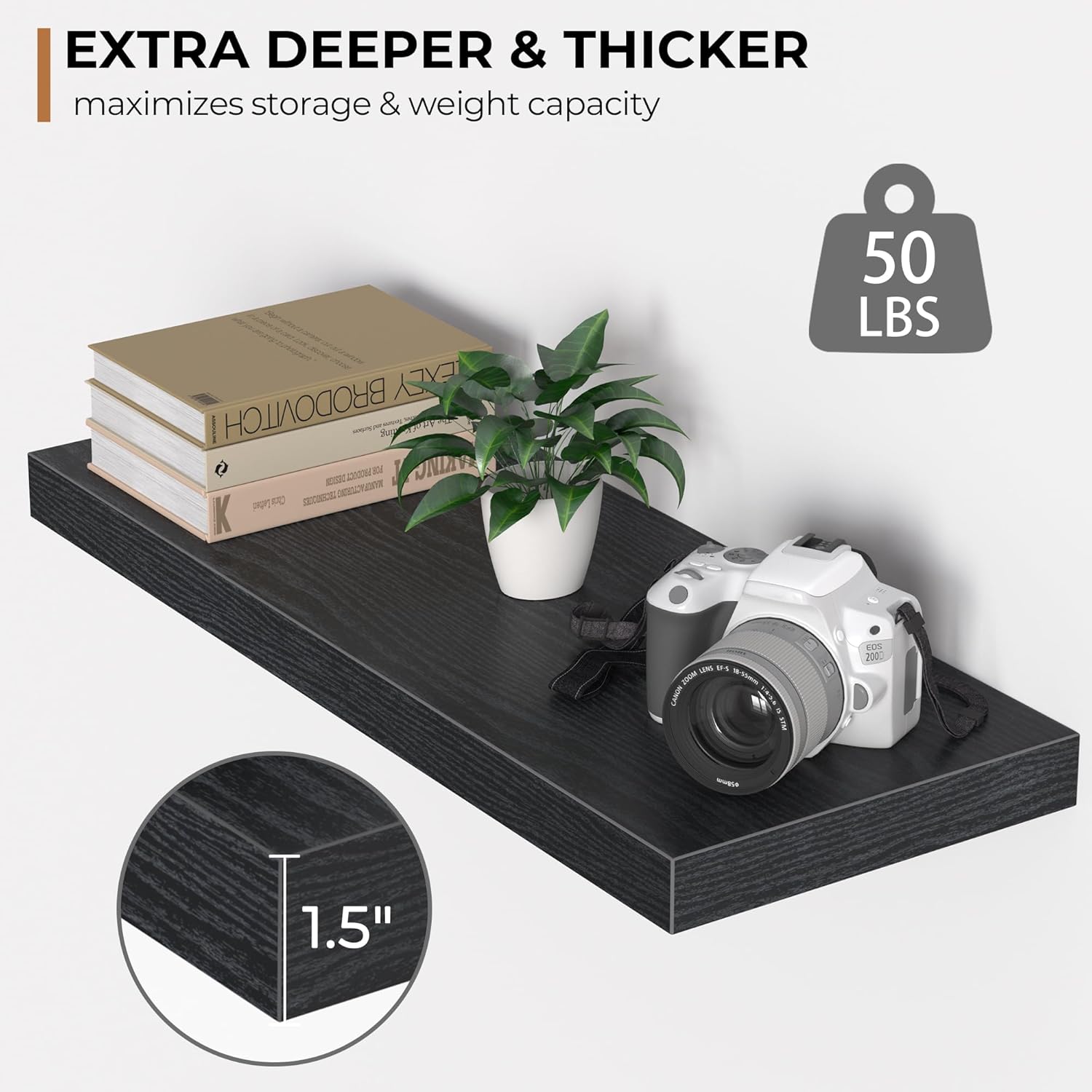 - Extra Deeper & Thicker - Each board measures 24"W x 9"D x 1.6"H. Extra deeper and thicker design in order to bring maximizes storage space and weight capacity, even hold up to 50 lb each. This floating shelf taking up zero square feet, reduces clutter and highlights dรฉcor in compact spaces.