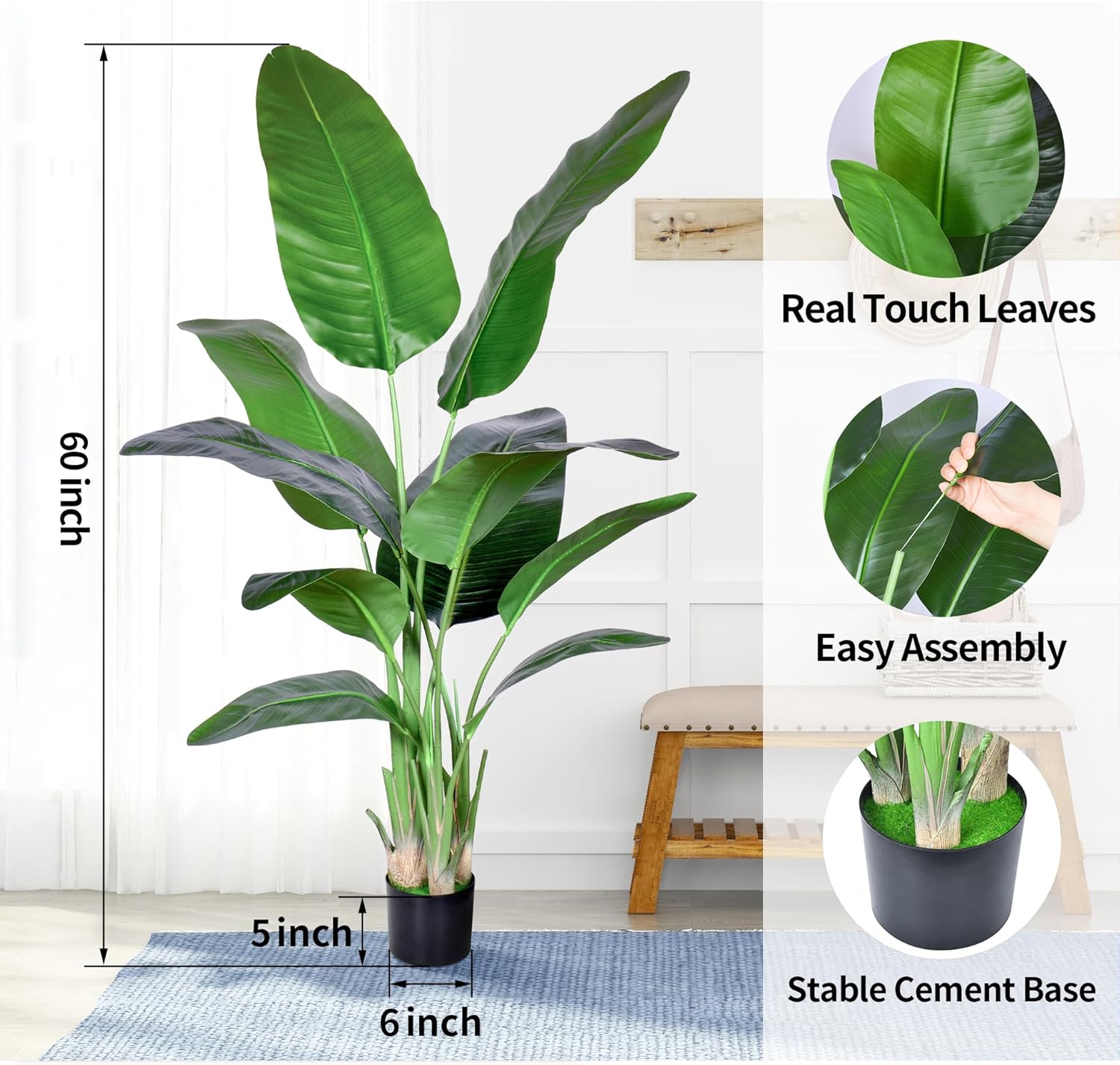 Artificial Bird of Paradise Plant,Faux Palm Tree Potted Plant with Real Touch Leaves,Fake Trees for Home Living Room Office Indoor Outdoor Decor(5FT-1Pack)