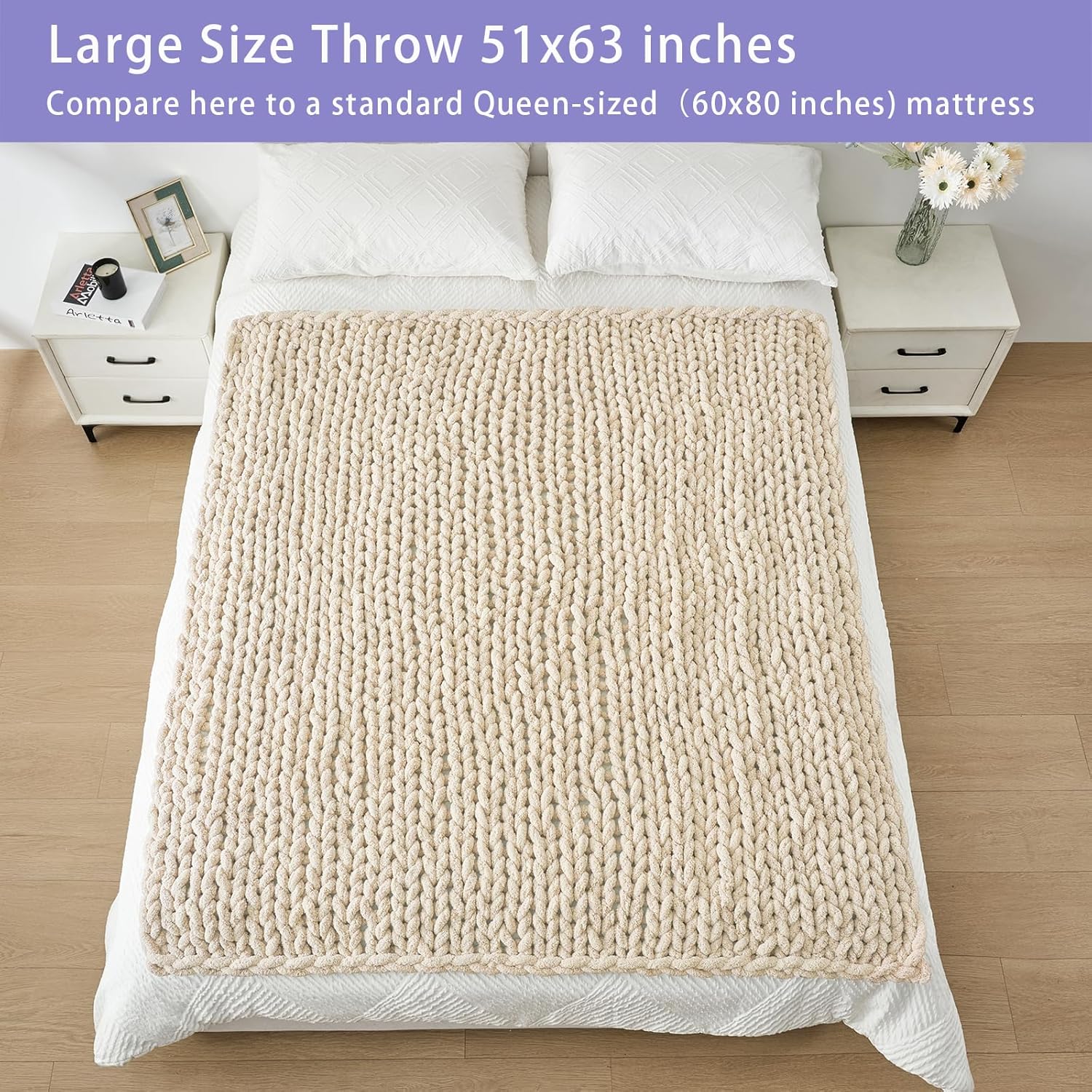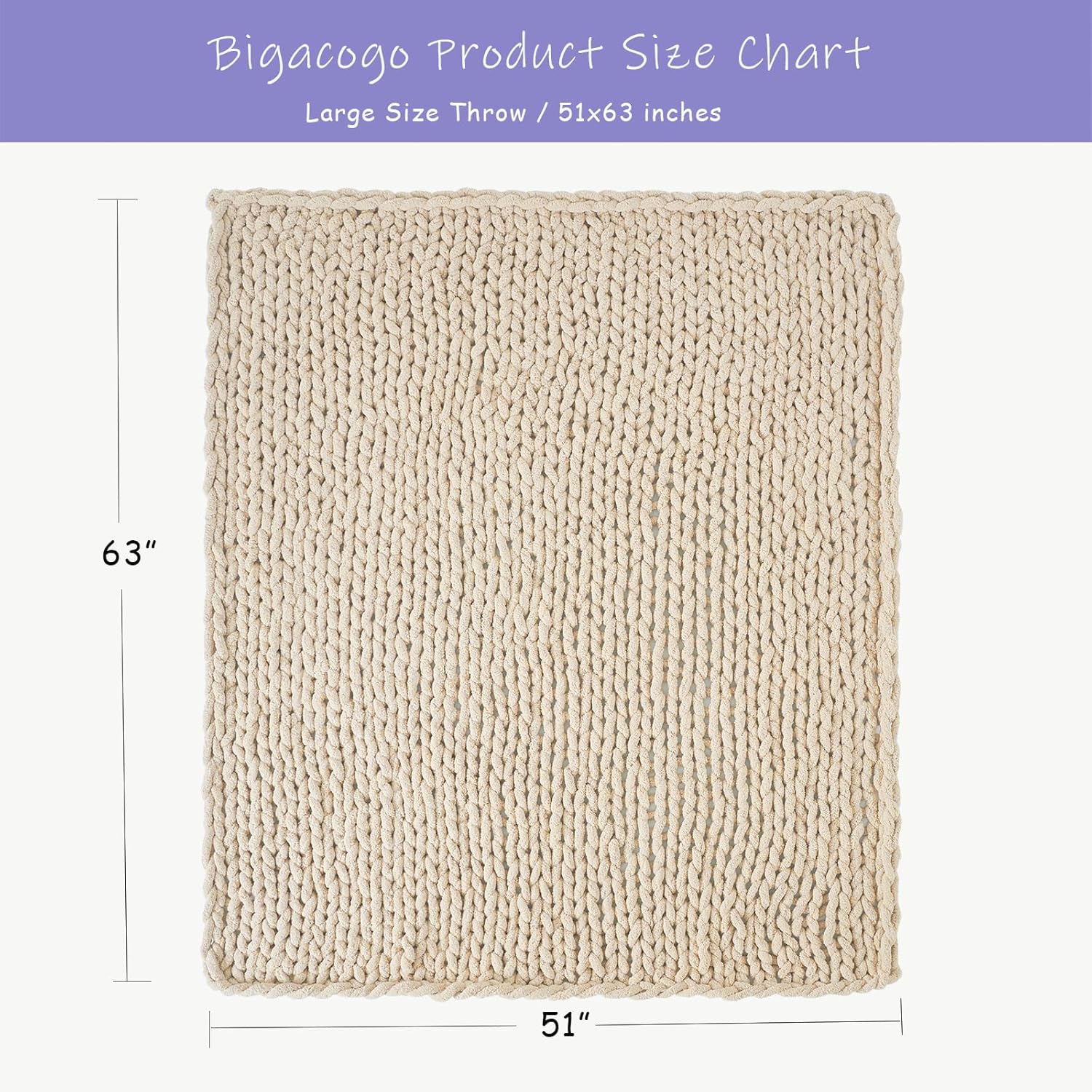 Bigacogo Chunky Knit Throw Blanket for Couch, 51x63 inches, 100% Hand Knitted with Thick Jumbo Chenille Yarn, Cozy Soft Large Rope Knot Cable Crochet Blankets for Sofa Bed Living Room, Beige