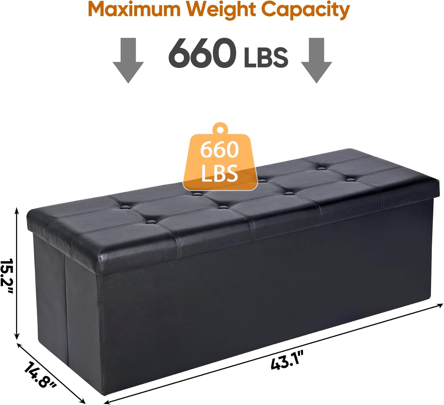 - Sturdy and Durable Materials - This comfortable long storage ottoman is made of quality thick cardboard, durable faux leather, has the load bearing capacity up to 660lbs. Waterproof soft faux leather, built-in thickened sponge, make the cushion is soft and comfortable. Black unit you see everywhere and a perfect match to your couch or dining room chairs