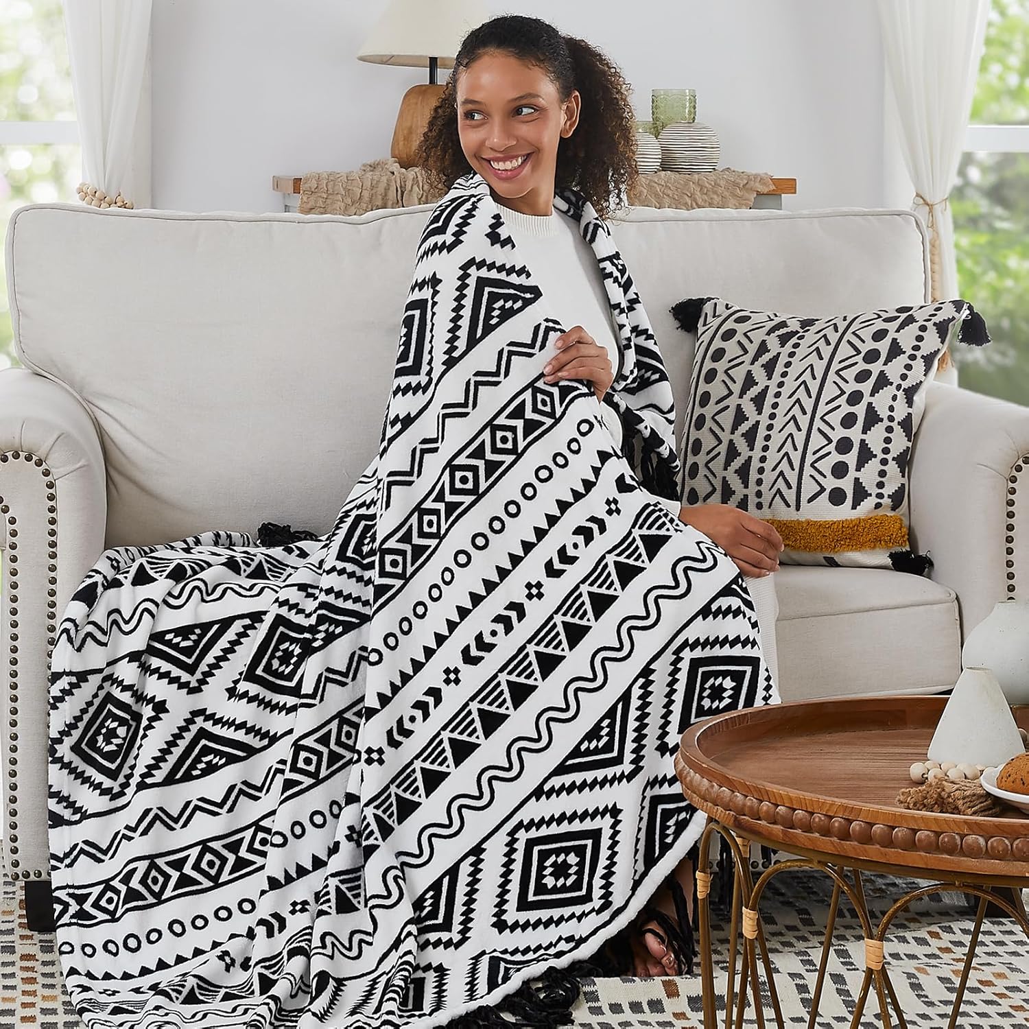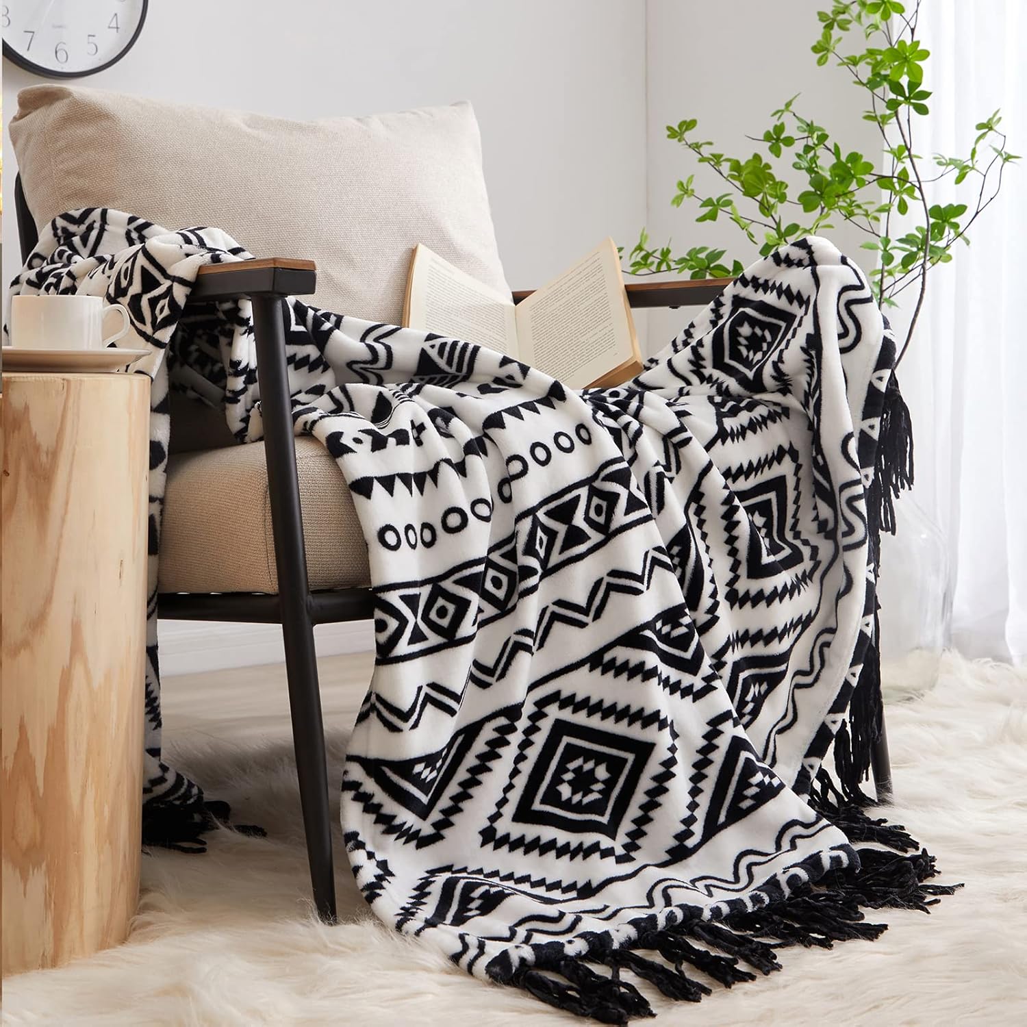 CASAAGUSTO Boho Throw Blanket - Black and White Decorative Blankets with Tassel, Printed Flannel Bohemian Blanket for Chair, Bed, Sofa, Couch(60 * 80, Black and White)