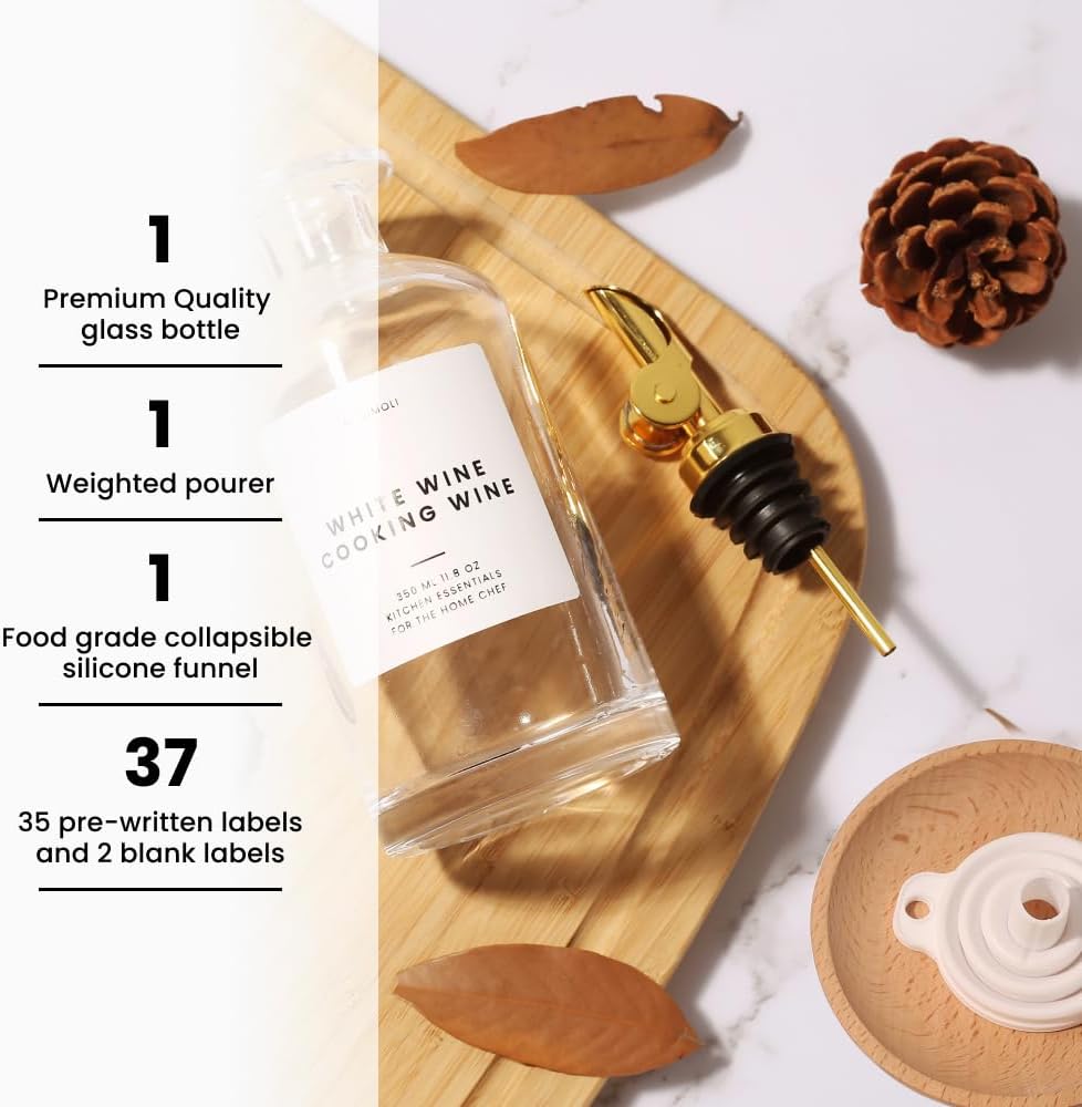 - Modern Kitchen Essential: Minimalism Inspired Cooking Oil Dispenser Bottle. This One High-quality 11.8 Oz (350 Ml) Glass Bottle, One Gold Pourers, a funnel, and a 37 Label Set.