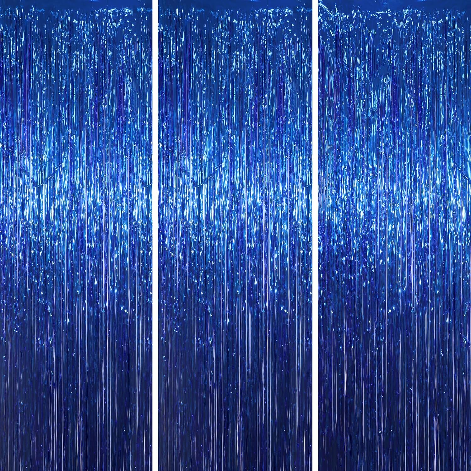 3 Pack 3.3x8.2 Feet Blue Foil Fringe Backdrop Curtains, Tinsel Streamers Birthday Party Decorations, Fringe Backdrop for Graduation, Baby Shower, Gender Reveal, Disco Party