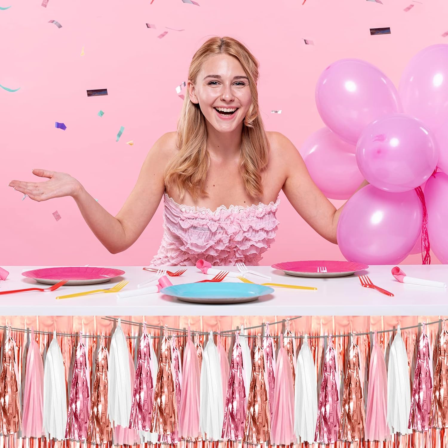 - 【Pink White Peach Rose Gold Party Supplies Set】: The total length of the pink white peach rose gold birthday tassels banner is 26.2 feet, divided into 4 strips, each 6.5 feet long. Each banner contains 15 tassels, and each tassel measures 14 inches, for birthday decorations many occasions, and so on